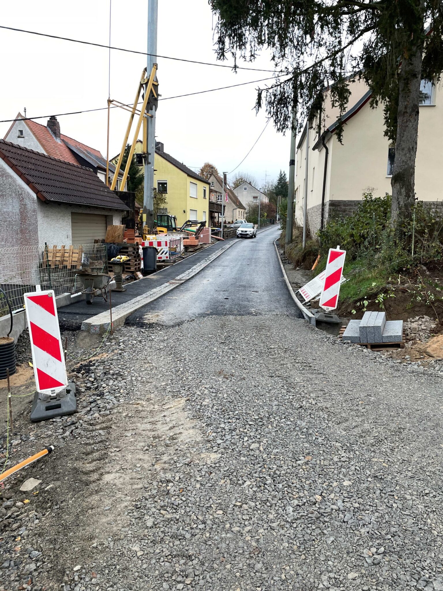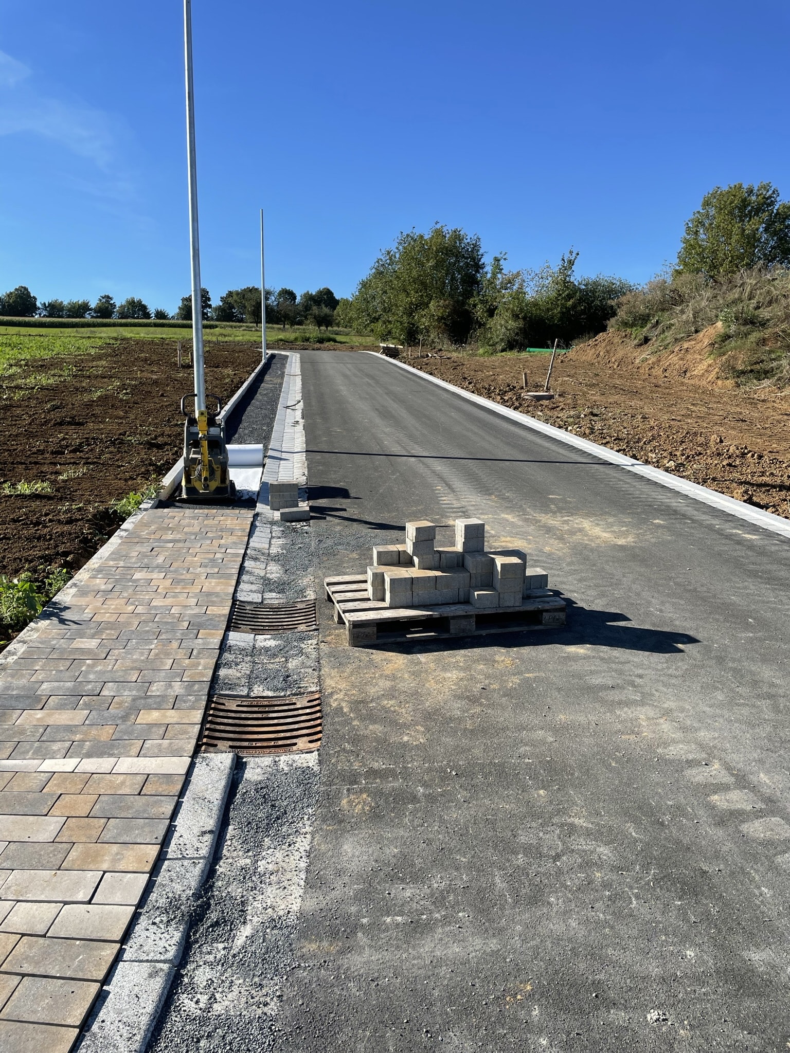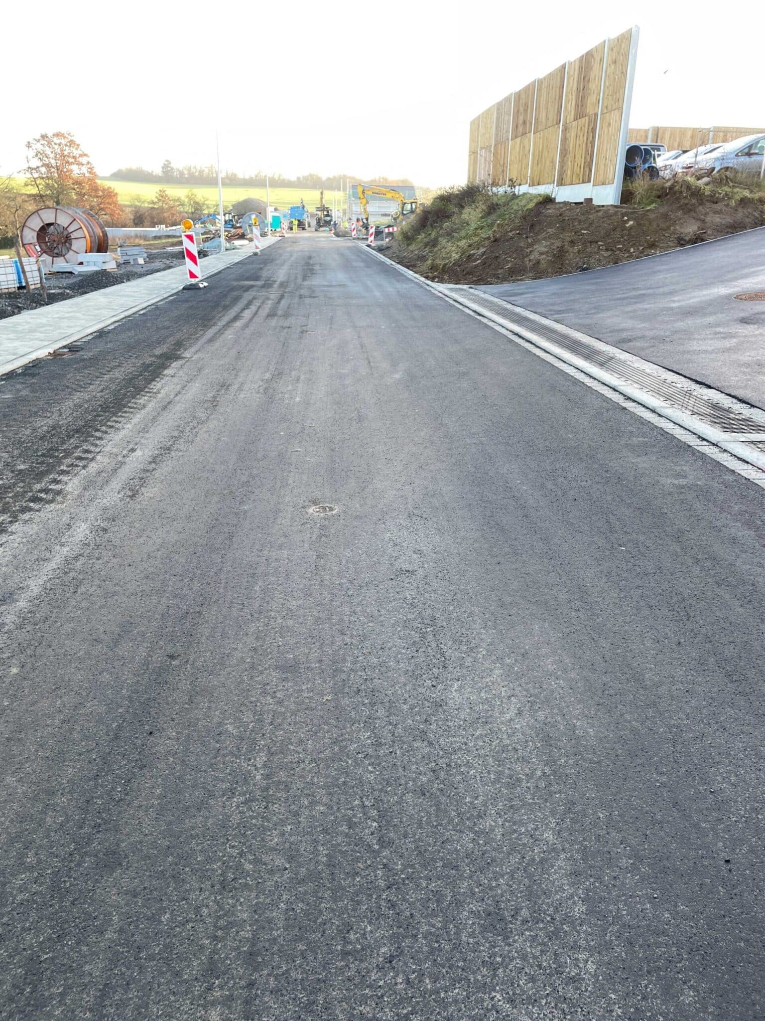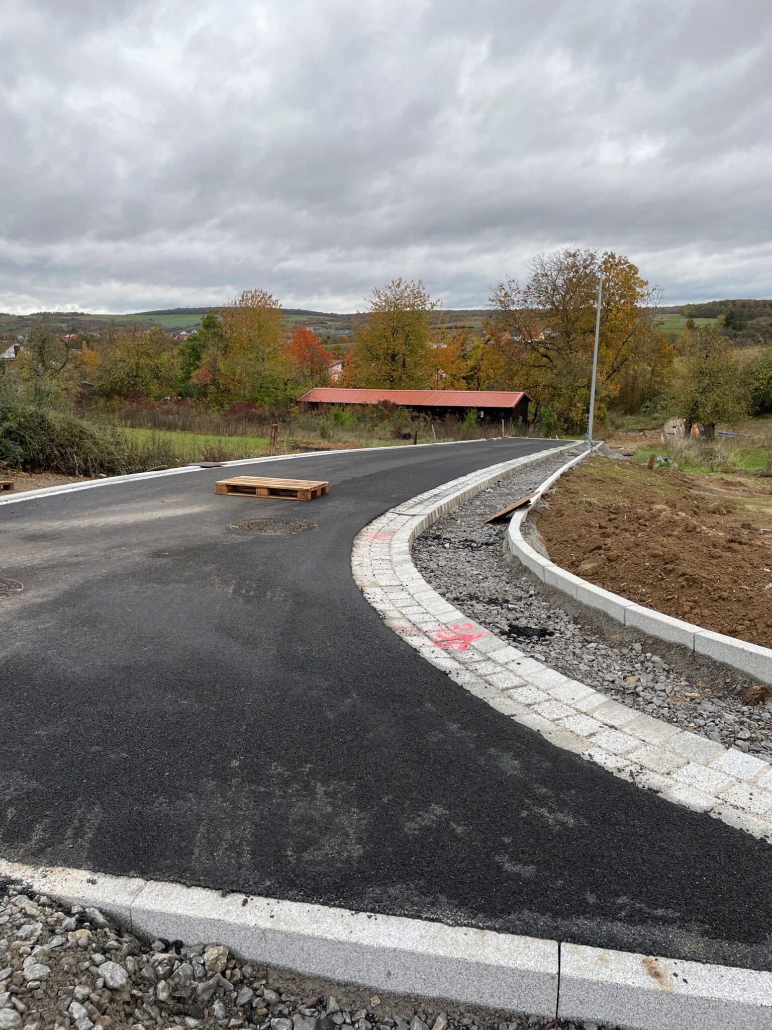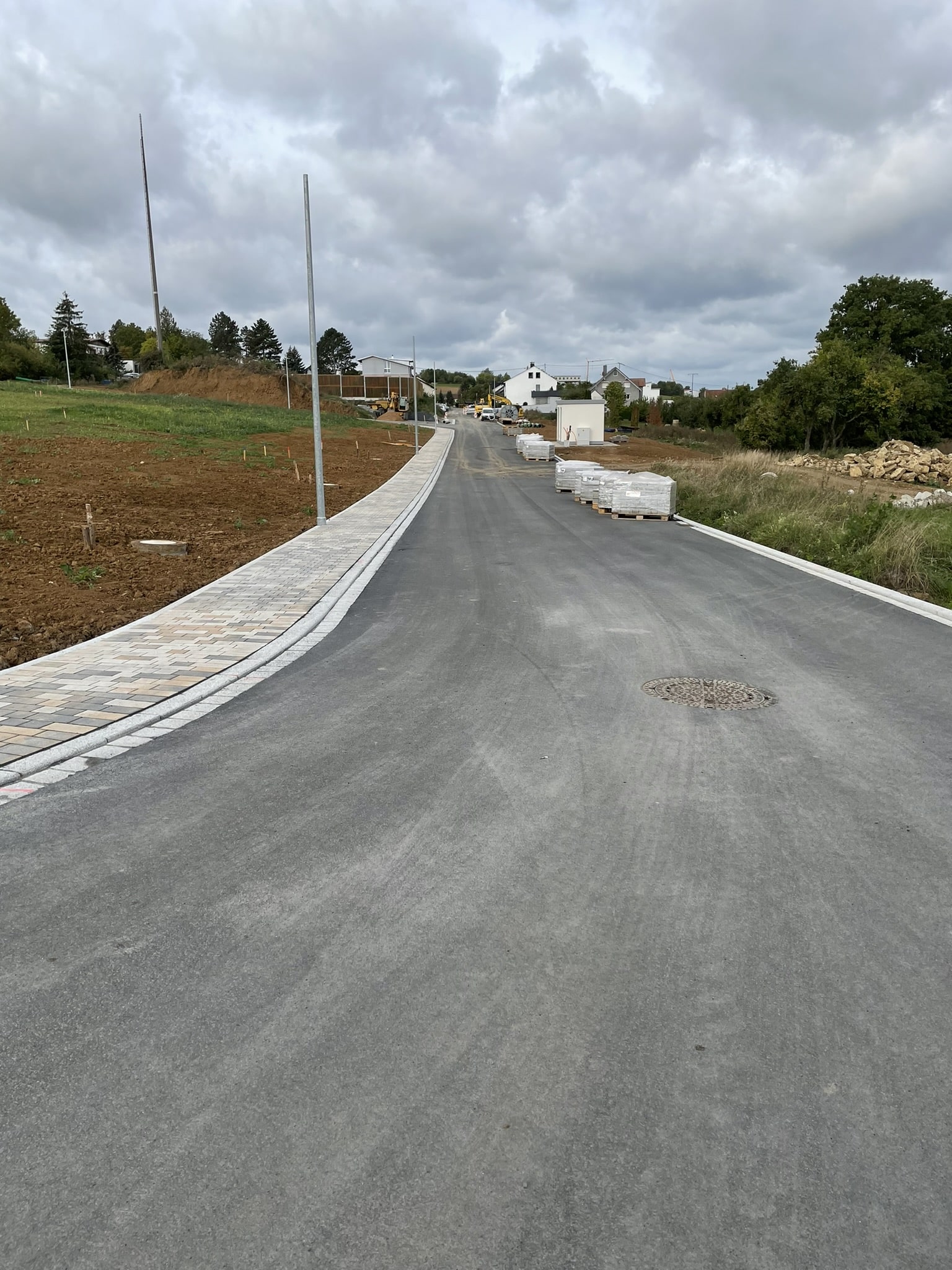 Der Asphalt ist von der Zufahrt Fa. Hartmann bis zum Baugebietsende eingebaut. Momentan werden die Gehwege gepflastert und Restarbeiten im Baugebiet ausgeführt.