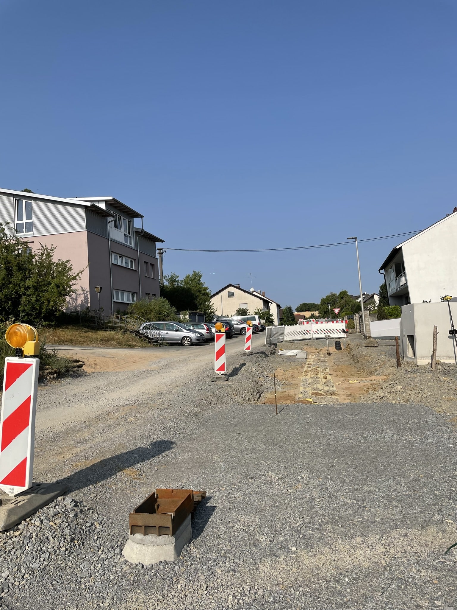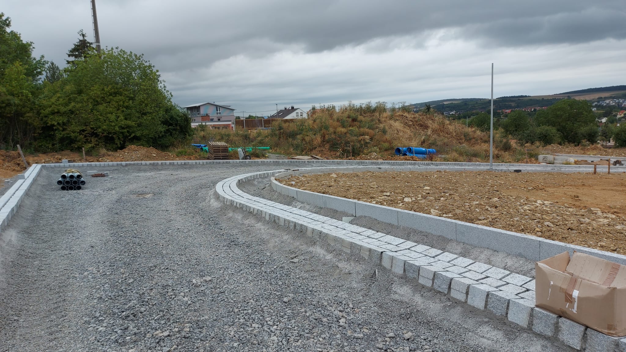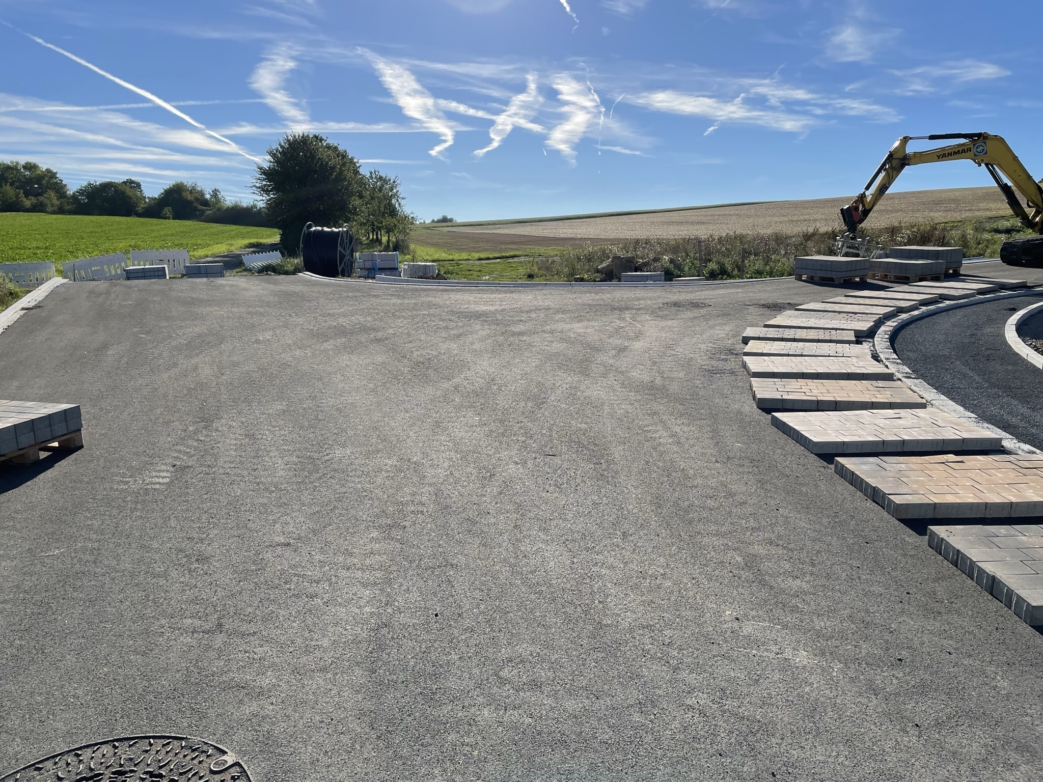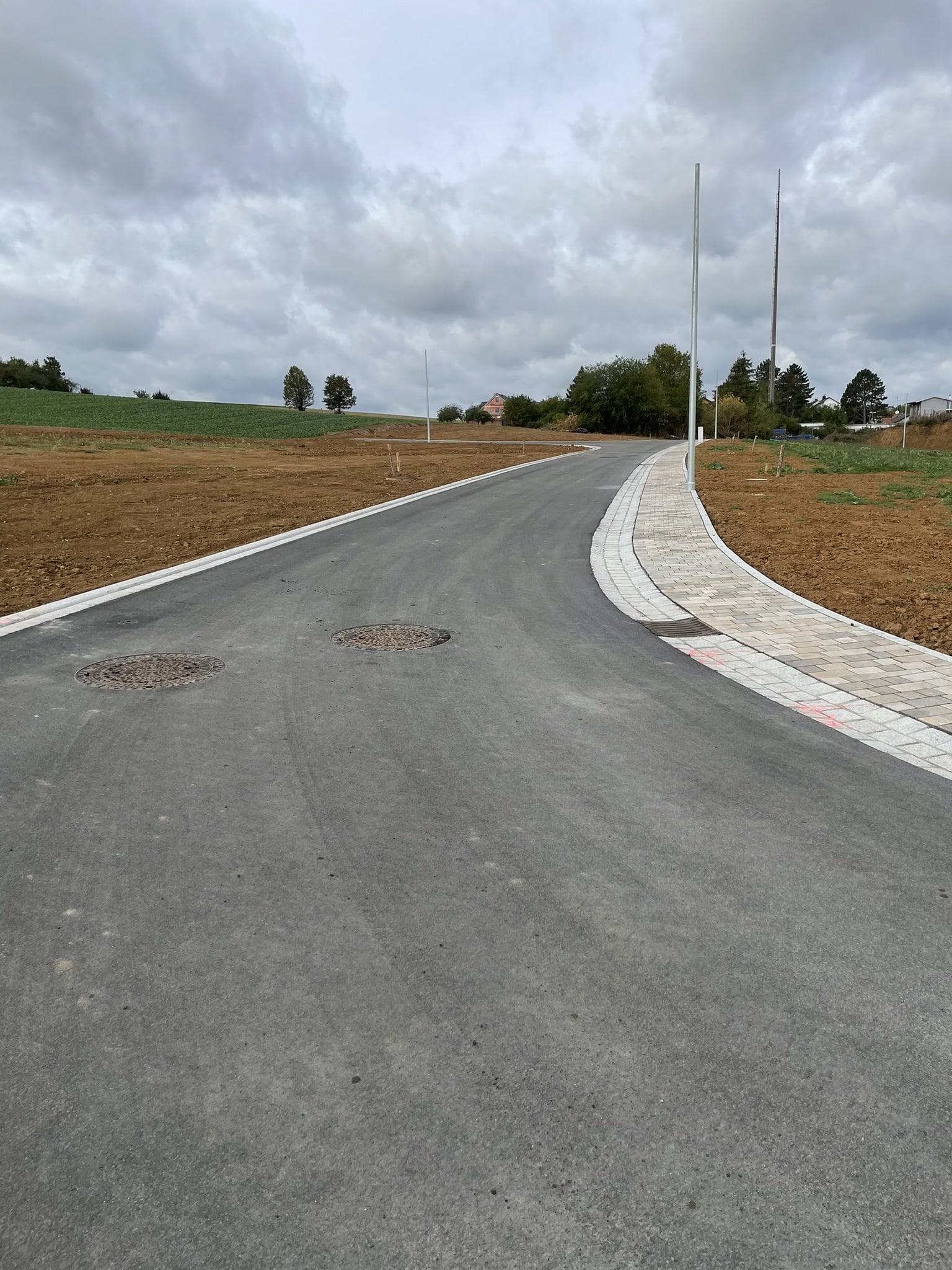 Der Asphalt ist von der Zufahrt Fa. Hartmann bis zum Baugebietsende eingebaut. Momentan werden die Gehwege gepflastert und Restarbeiten im Baugebiet ausgeführt.