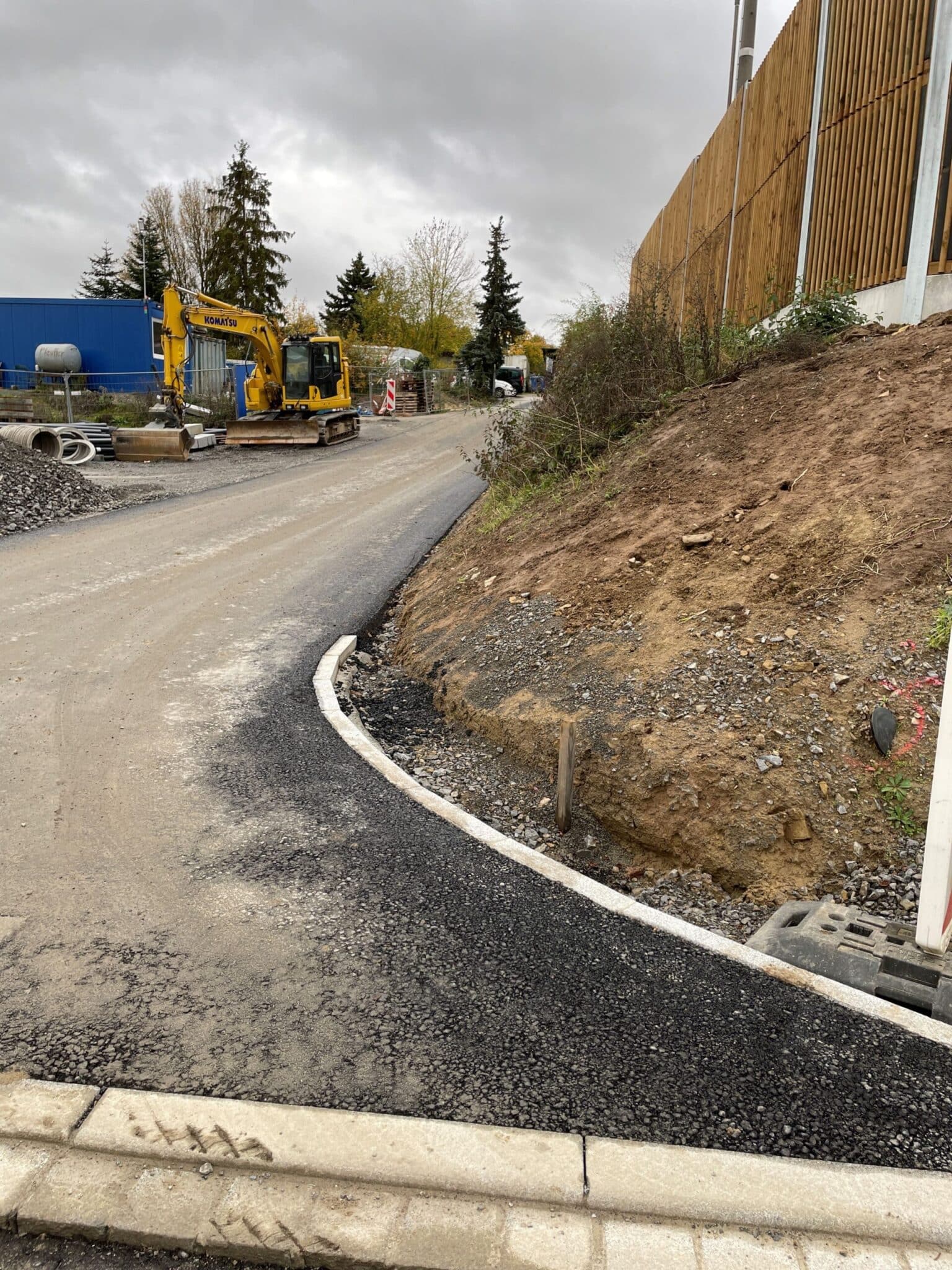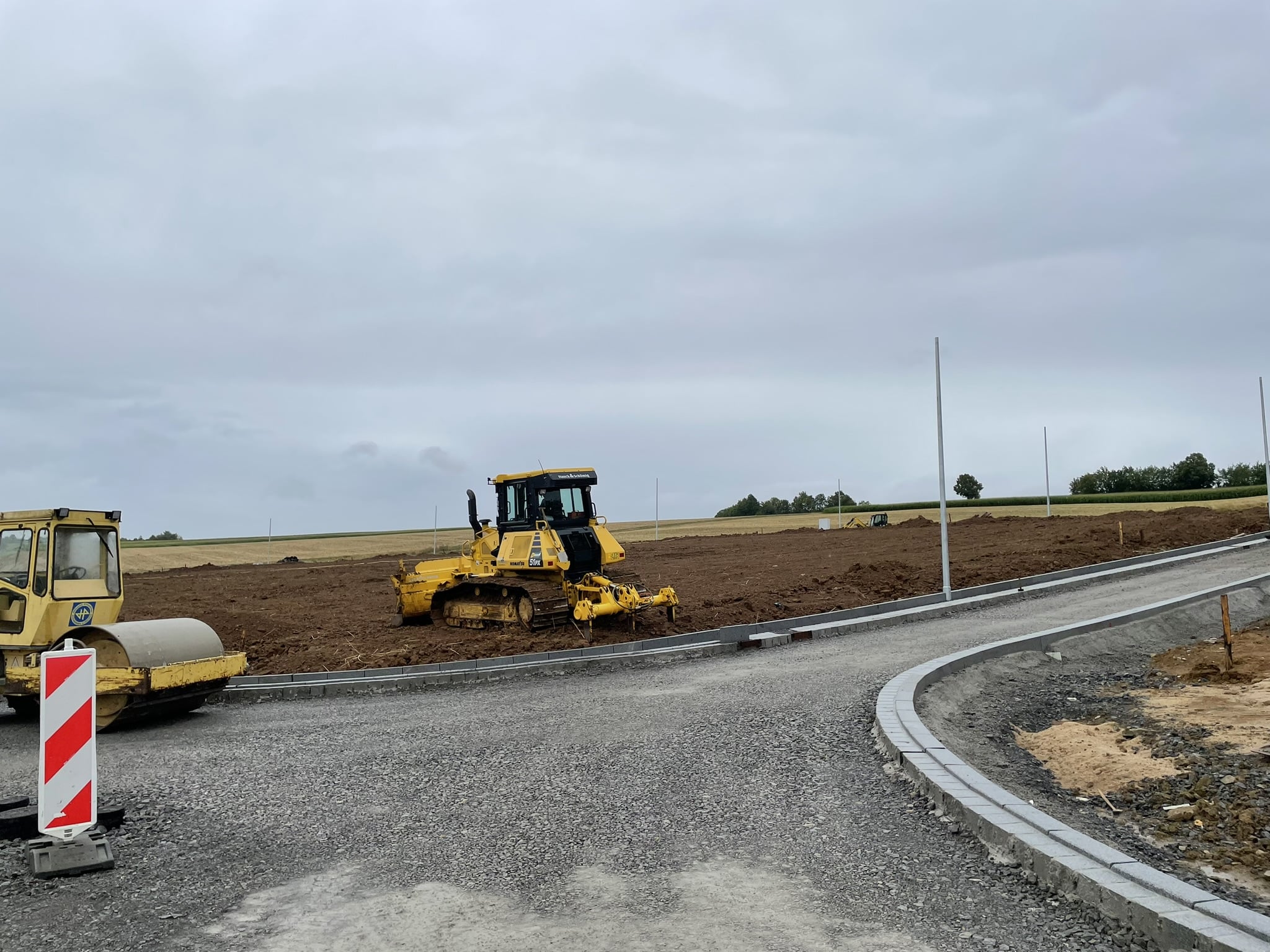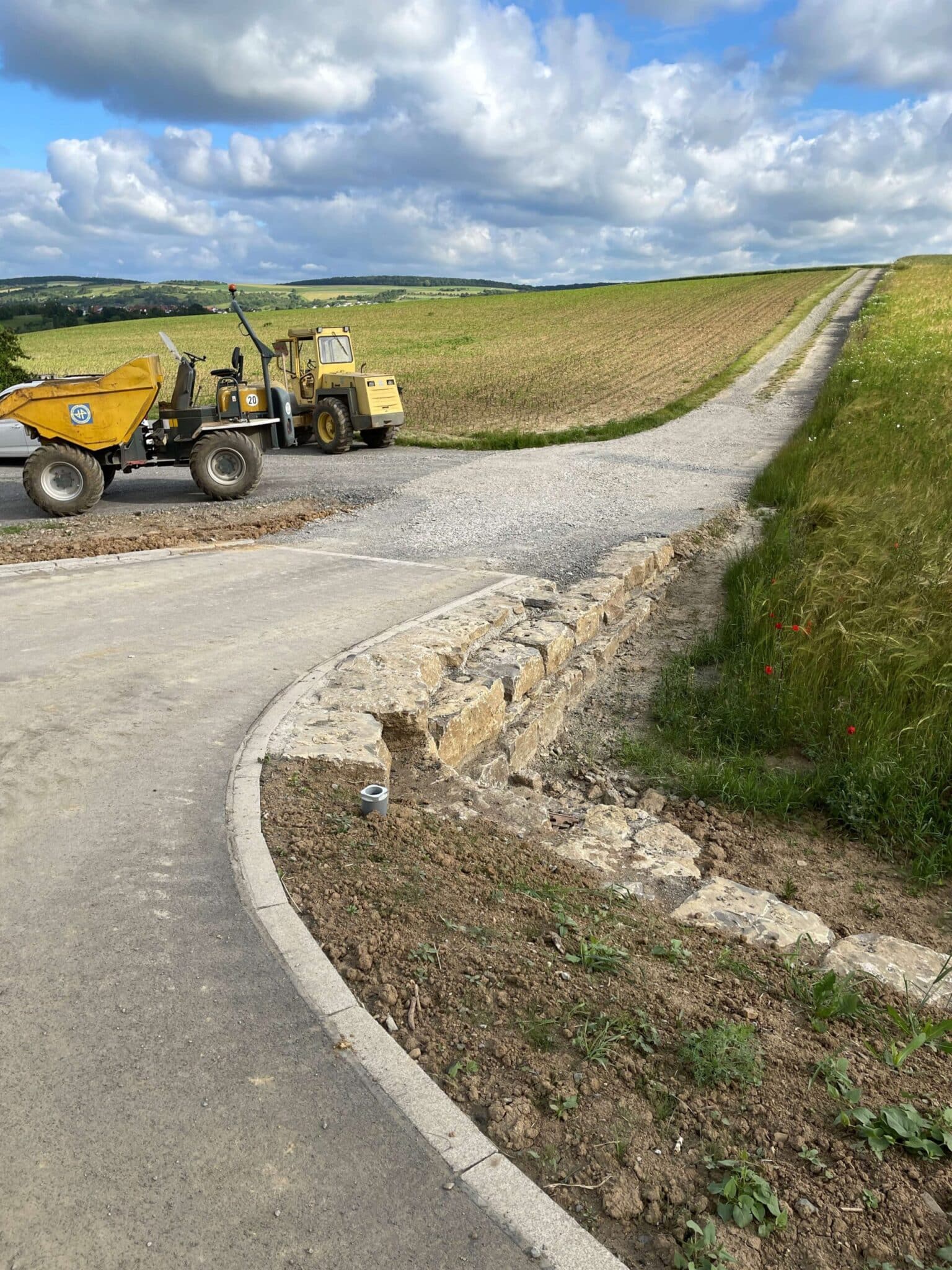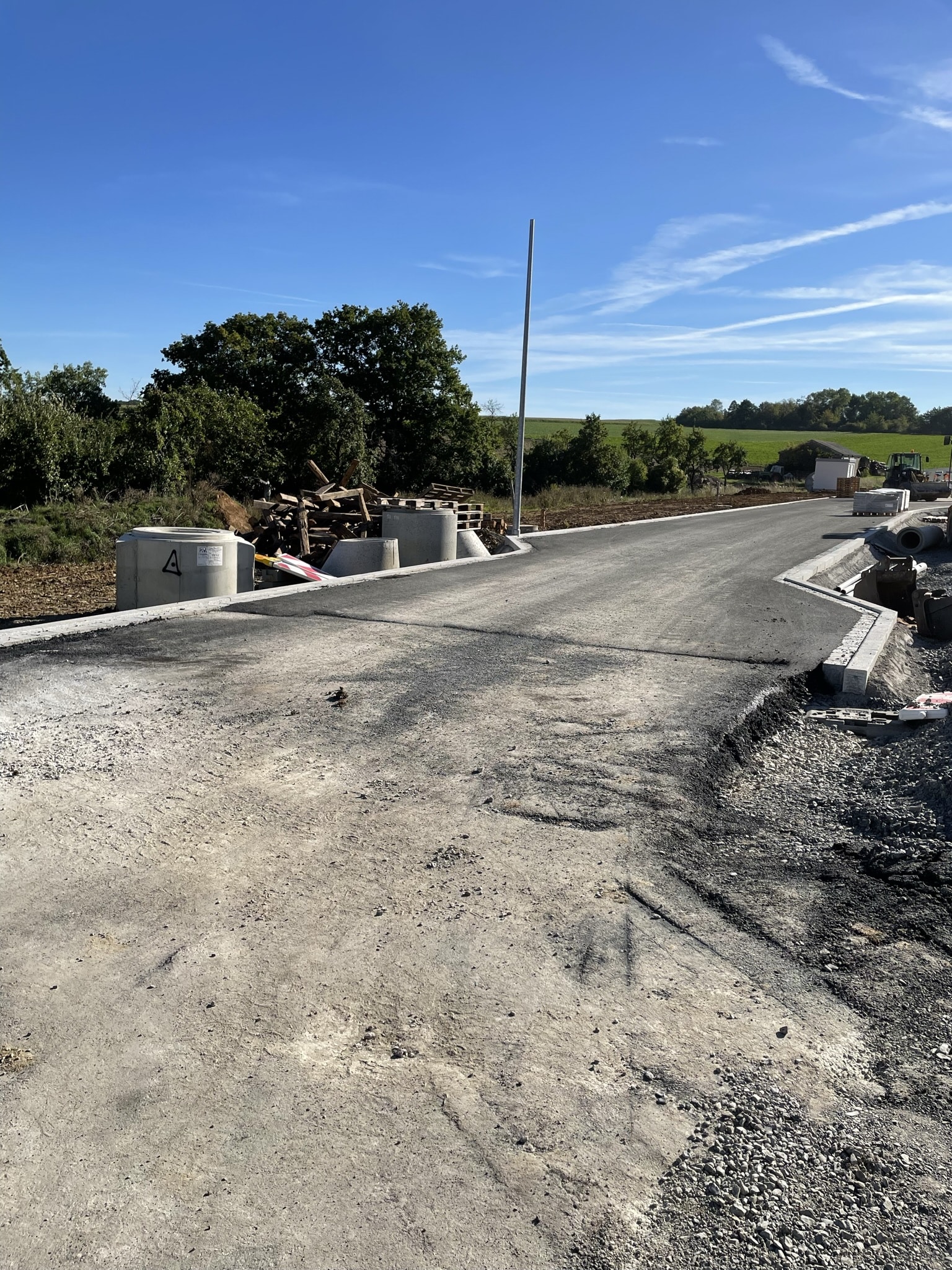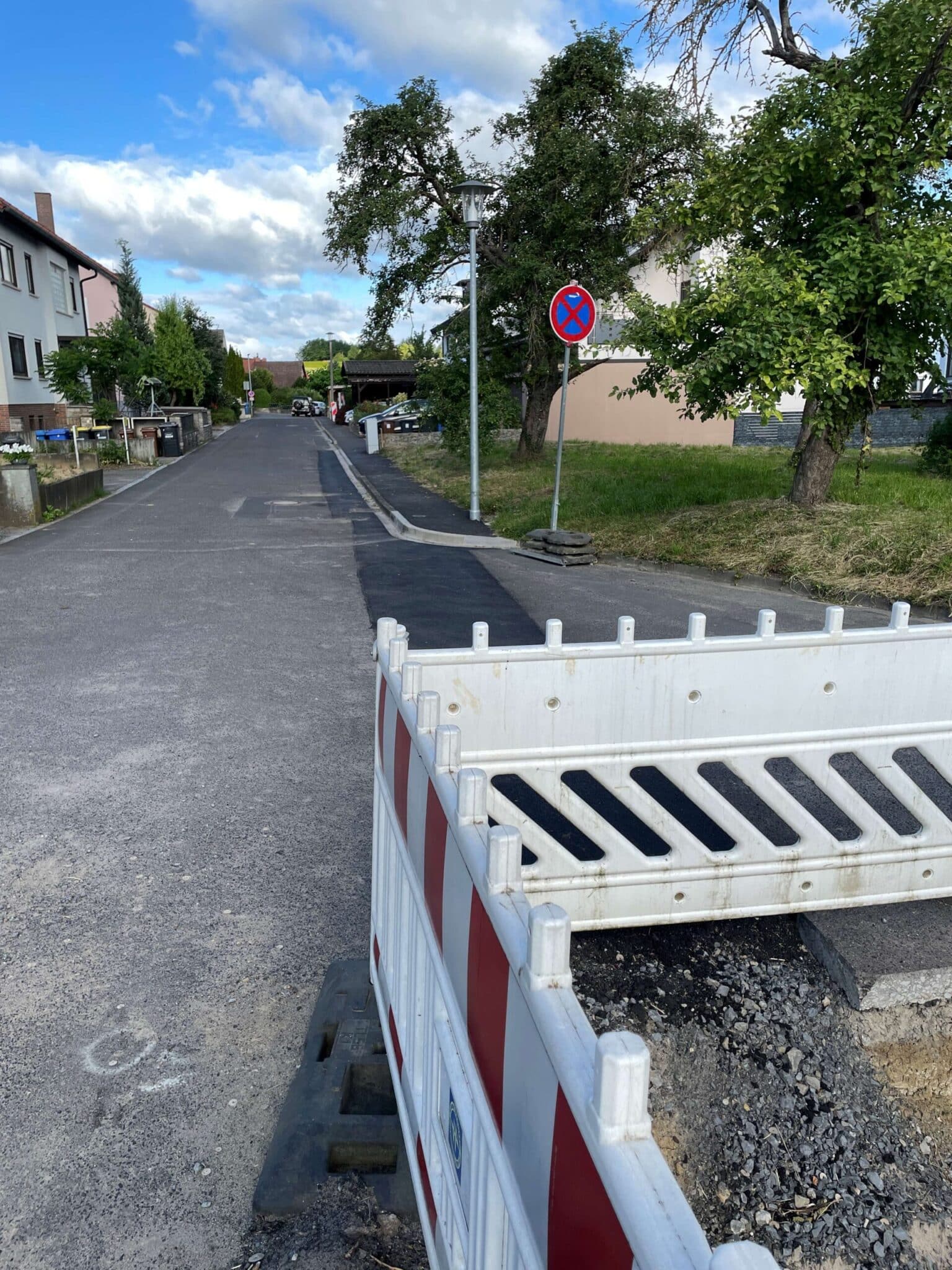 Der Asphalt ist von der Zufahrt Fa. Hartmann bis zum Baugebietsende eingebaut. Momentan werden die Gehwege gepflastert und Restarbeiten im Baugebiet ausgeführt.