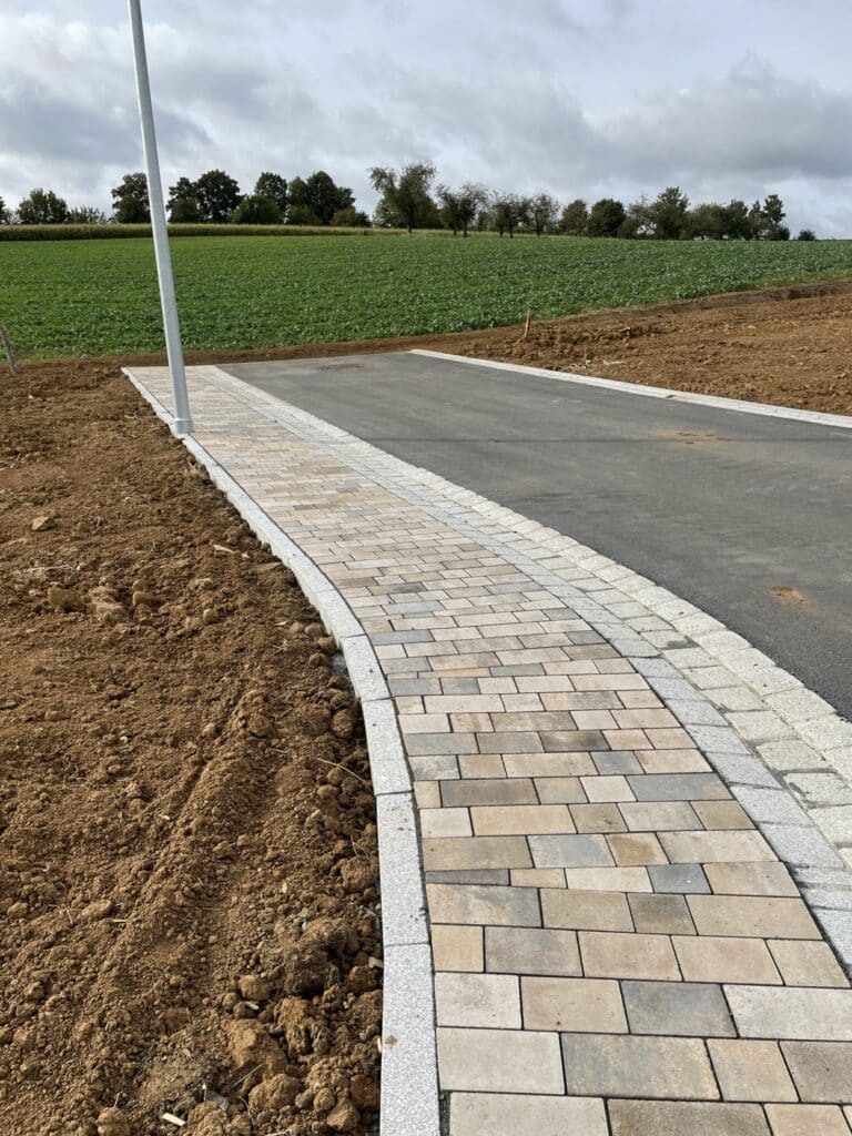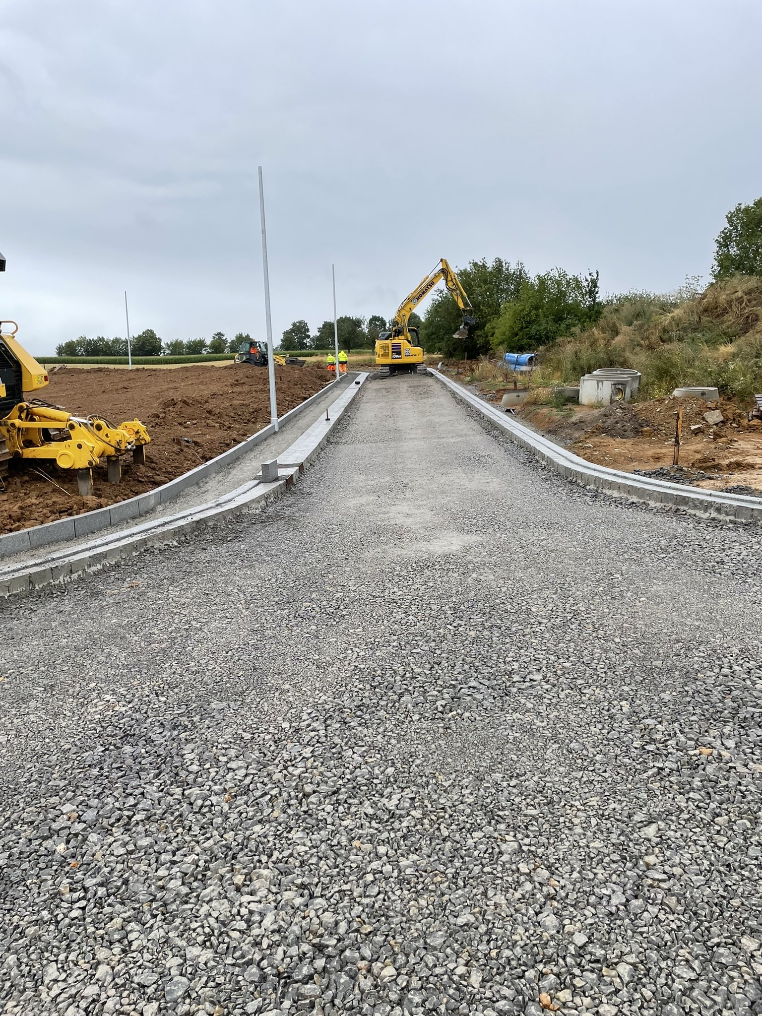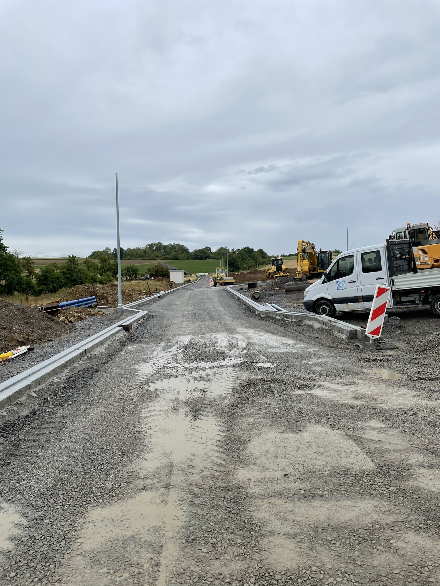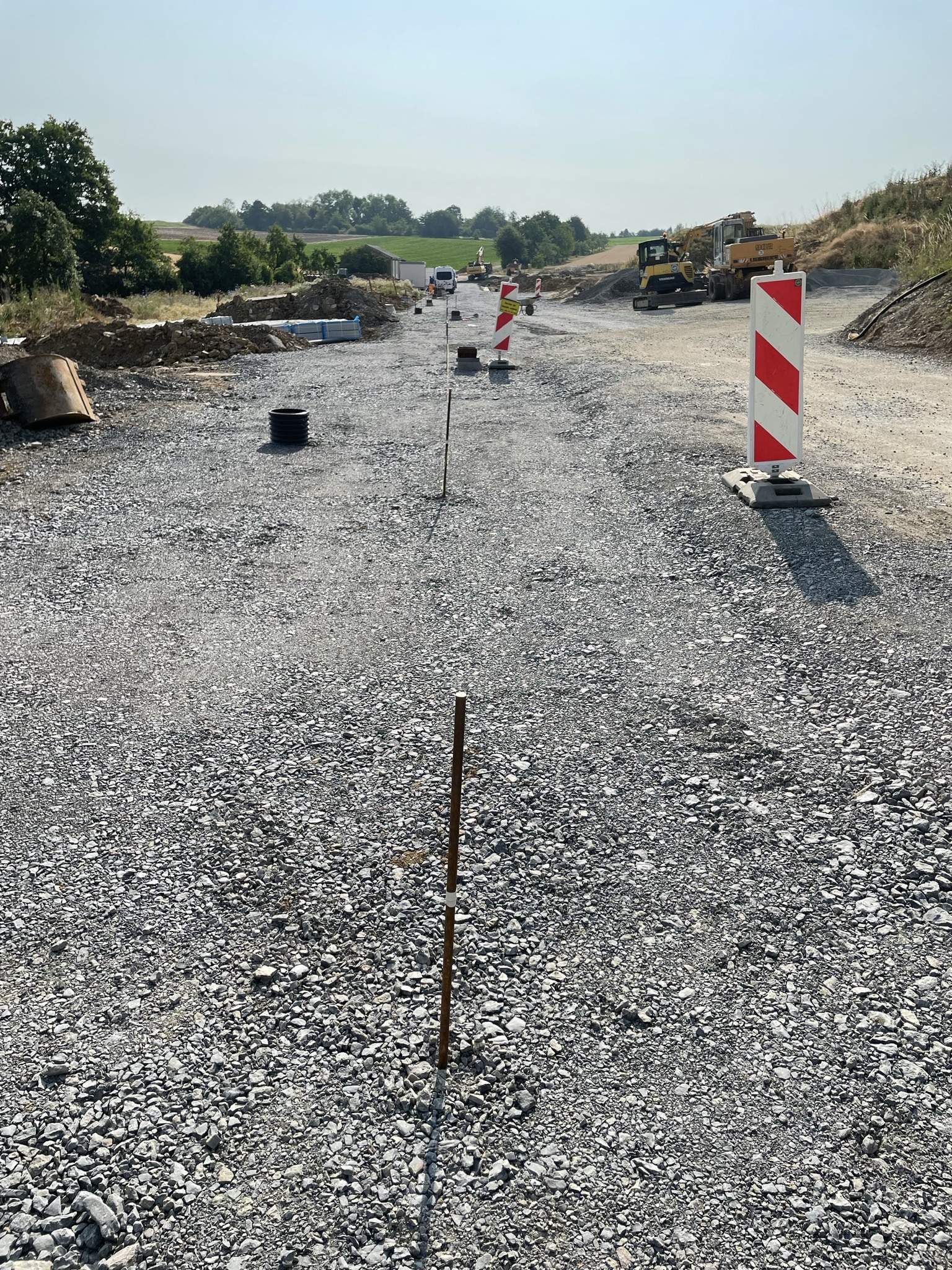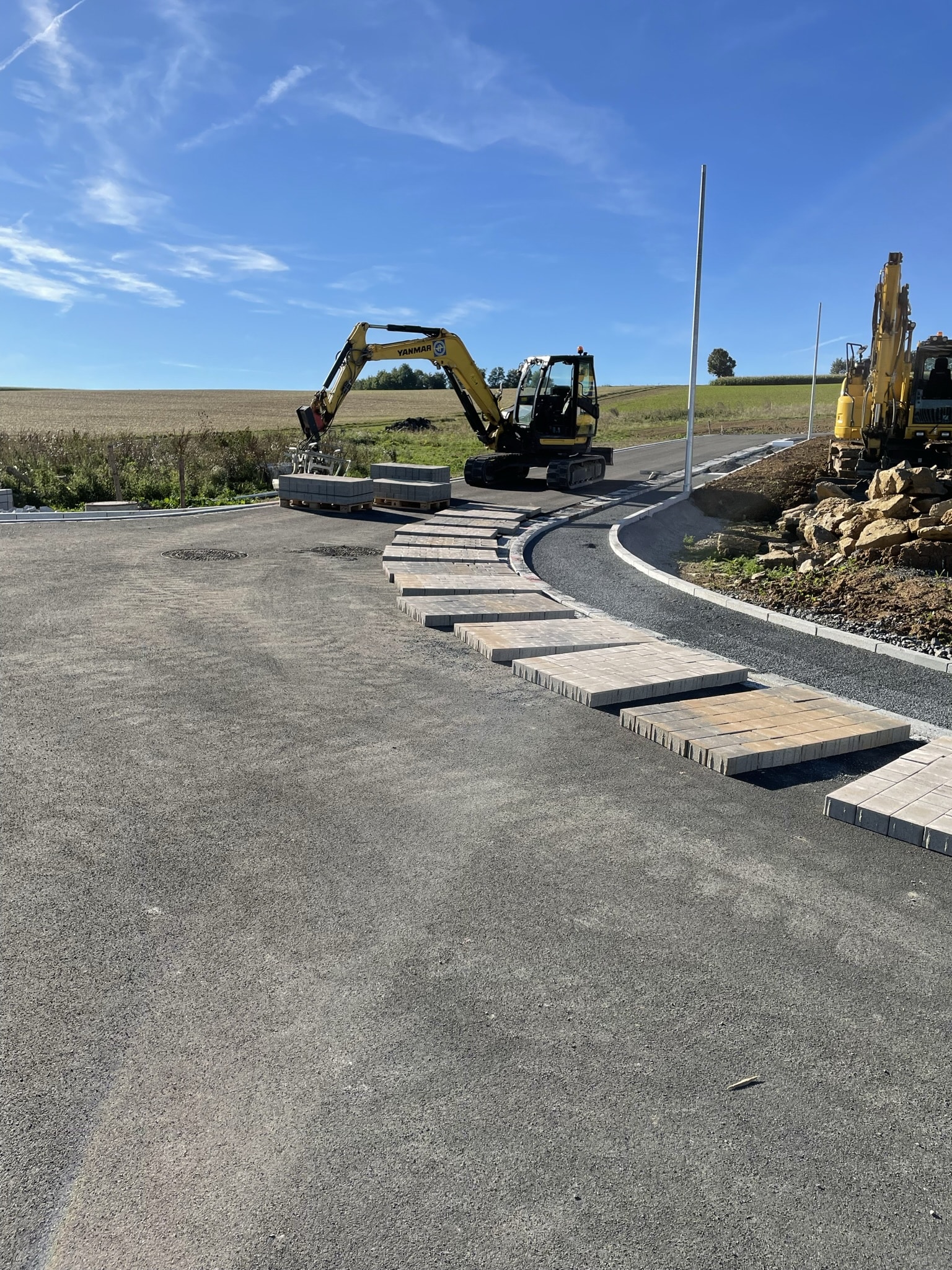 Der Asphalt ist von der Zufahrt Fa. Hartmann bis zum Baugebietsende eingebaut. Momentan werden die Gehwege gepflastert und Restarbeiten im Baugebiet ausgeführt.
