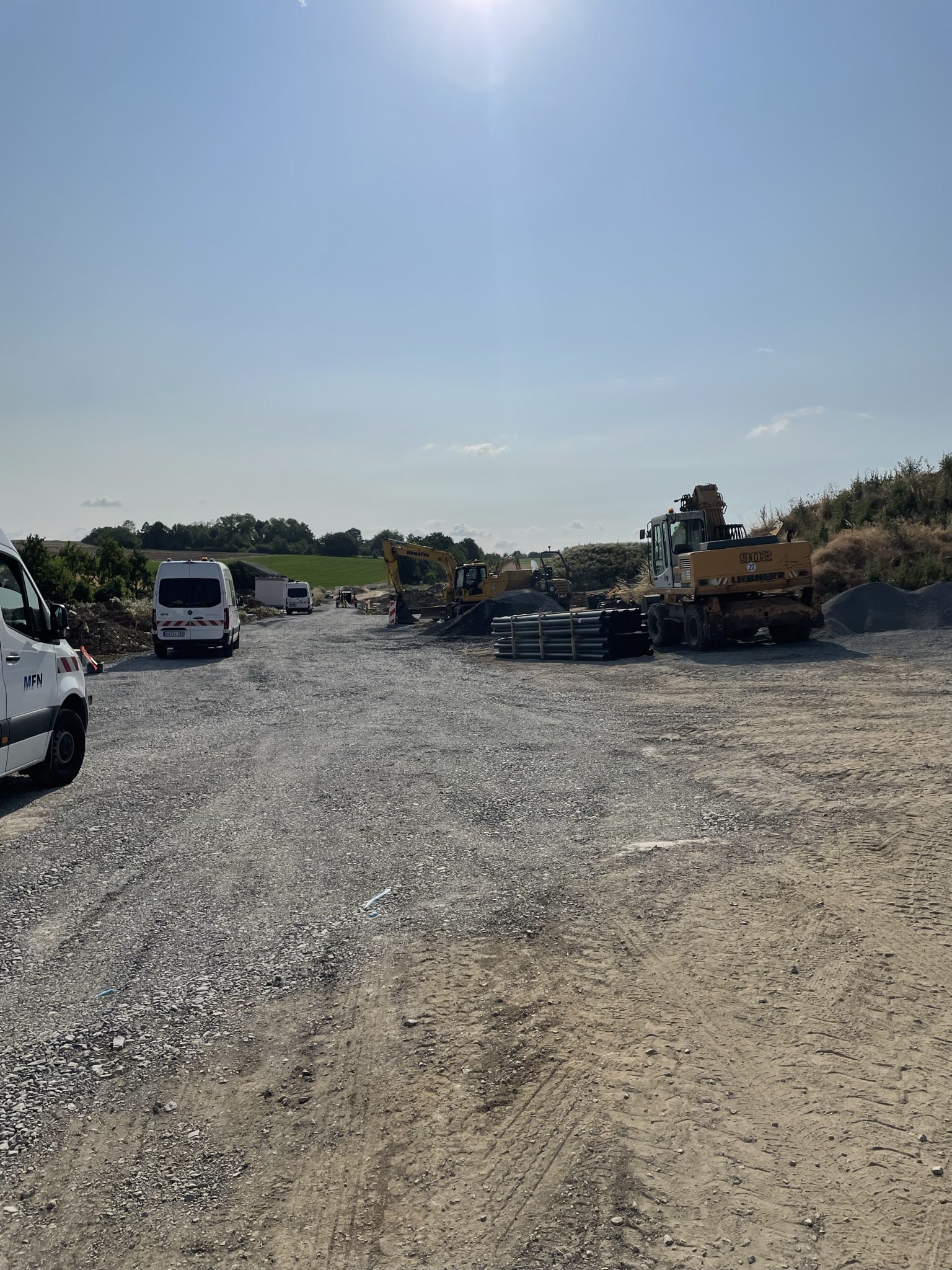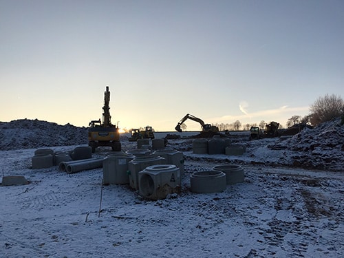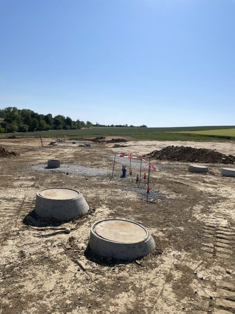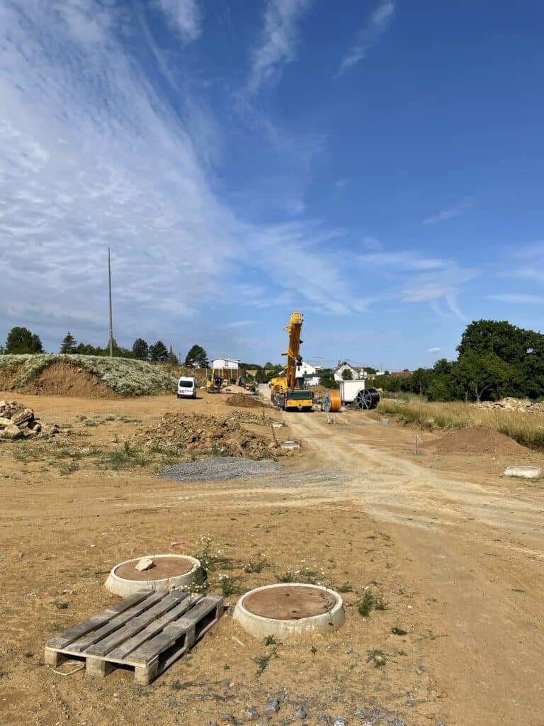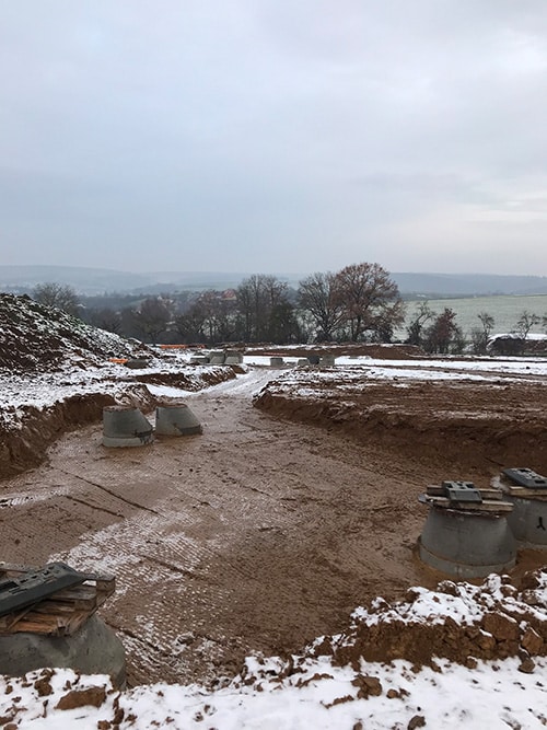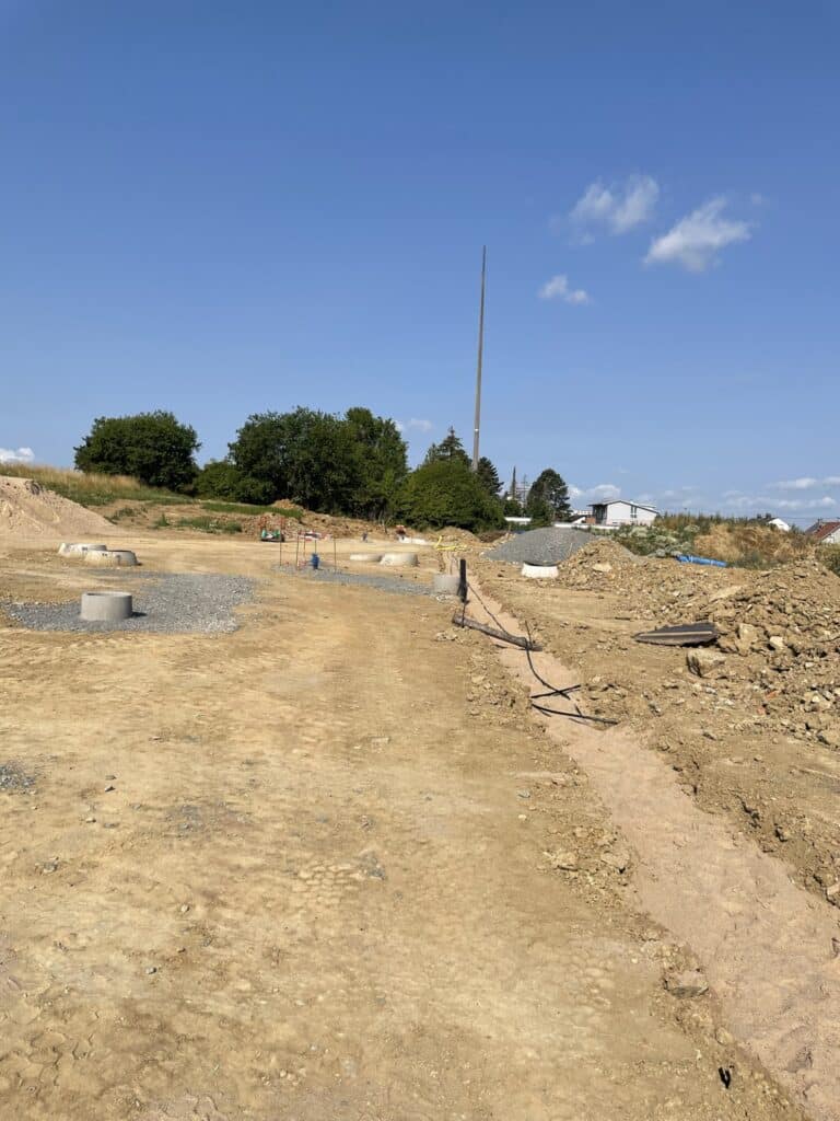 Weiterhin wurden schon diverse Materialien, wie z.B. Kanalschächte und -Rohre geliefert und mit vorbereitenden Maßnahmen, wie z.B. Oberbodenabtrag begonnen.