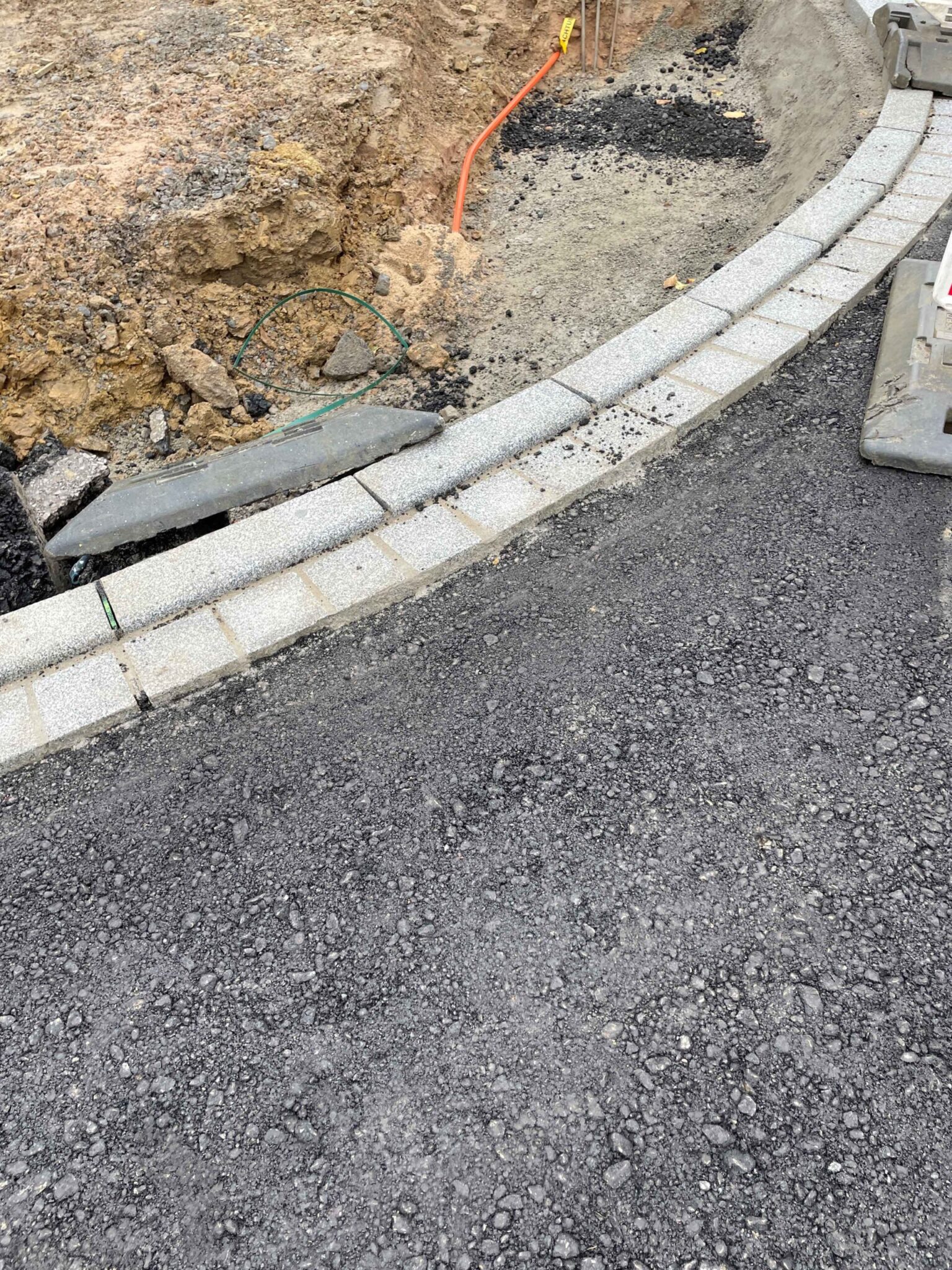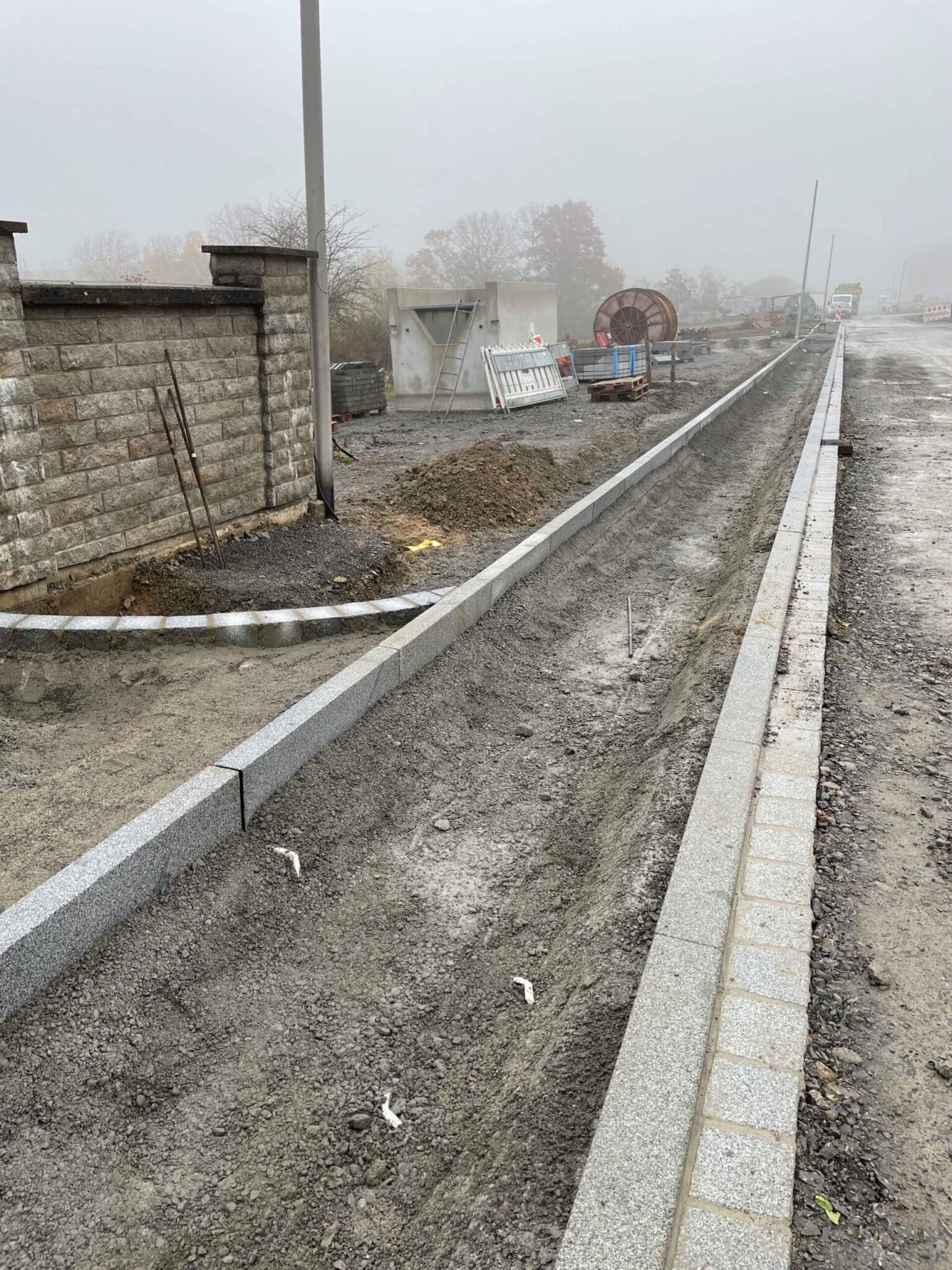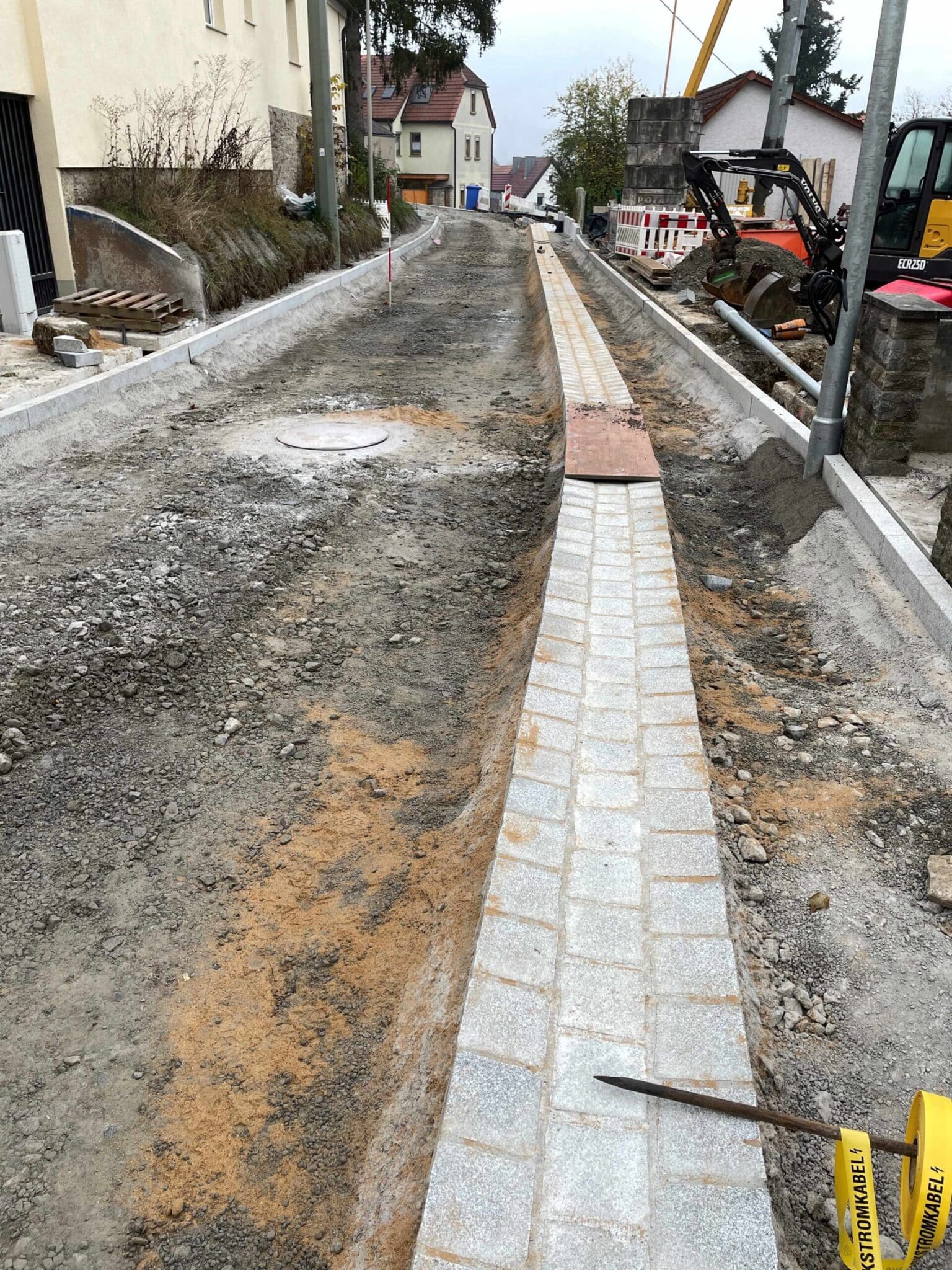 Die Fa. Pfeuffer ist die nächste Zeit mit der Fertigstellung der Randeinfassungen und des Schotterplanums in den Straßen- und Gehwegflächen beschäftigt. Weiterhin ist der Einbau der Drainasphaltschicht in den Gehwegen und das Gehwegpflaster geplant.