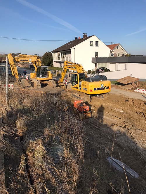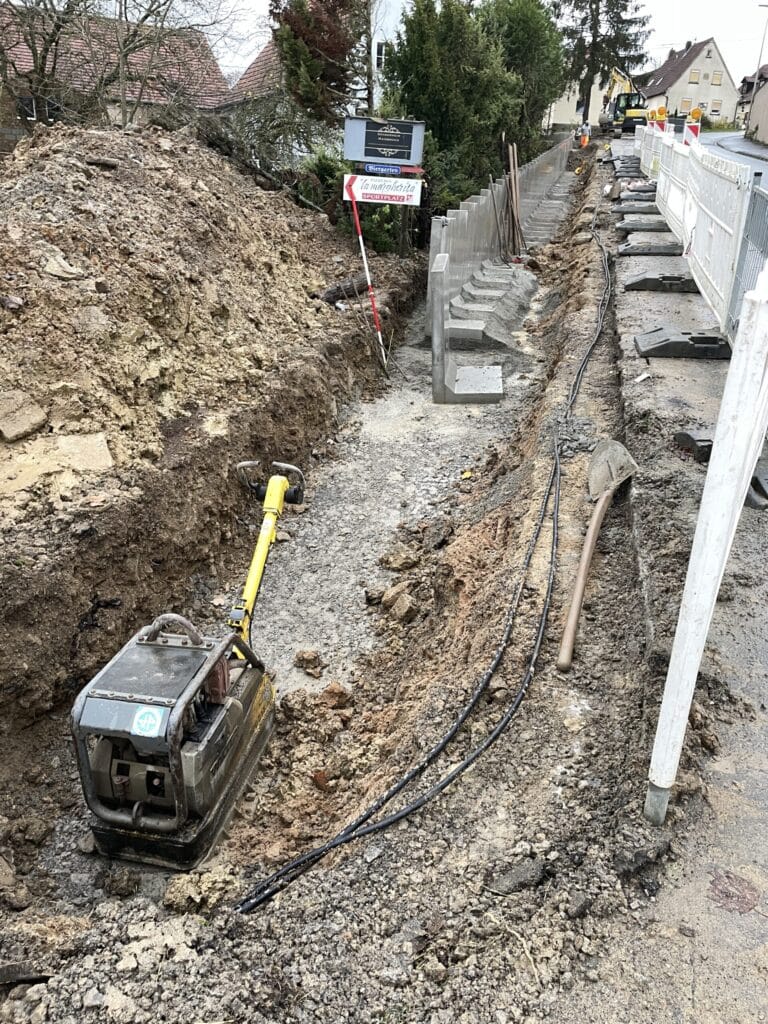 Da es auf Grund der aktuellen Witterungs- und dadurch auch Bodenverhältnisse nicht möglich ist, in den unbefestigten Flächen zu arbeiten, wird der Leitungsbau im Bereich der Straße unterhalb der Feuerwehr bis zur Einmündung Estenfelder Straße vorgezogen. Um eine Durchfahrt für die Fa. Hartmann, die Feuerwehr und Anwohner zu gewährleisten, wird das Baufeld so schmal wie möglich gehalten.