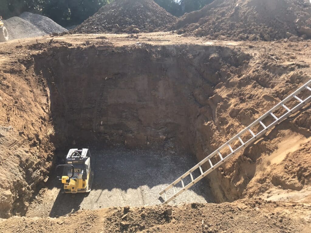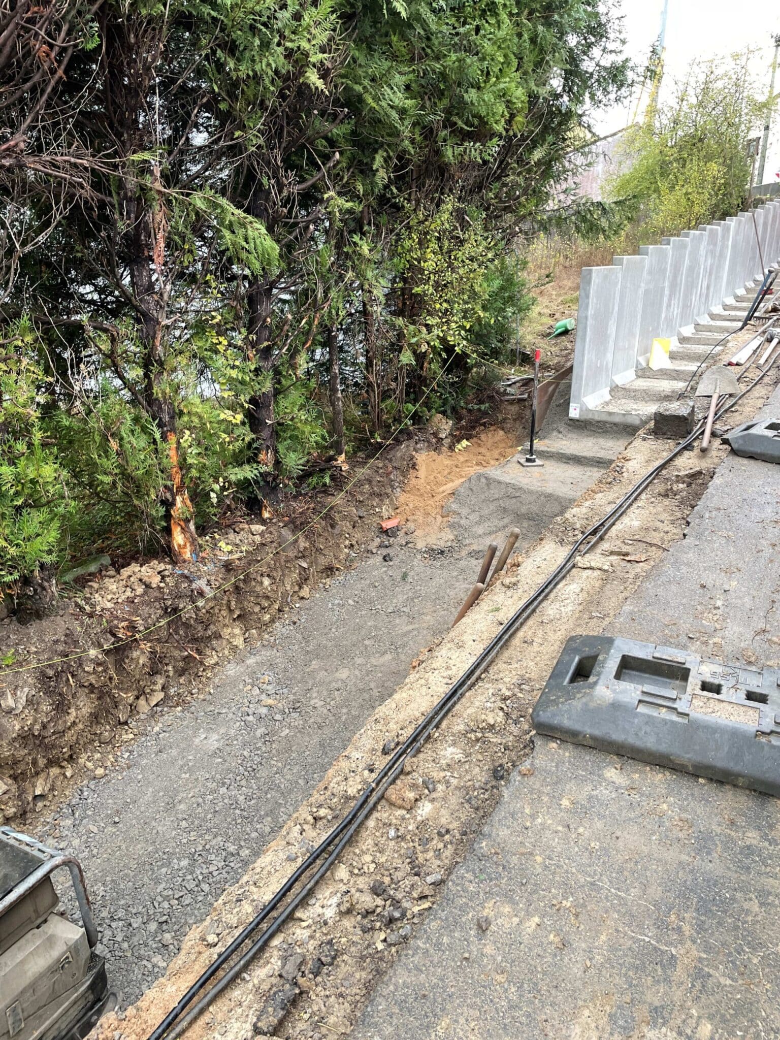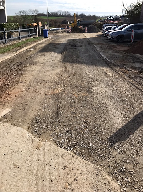 Bei den Aushubarbeiten zur Herstellung des tragfähigen Unterbaus wurde festgestellt, dass der vorhandene Untergrund nicht ausreichend tragfähig ist. Deswegen muss ca. 30cm tiefer „ausgekoffert“, ein Filtervlies verlegt und eine Bodenverbesserung aus Grobschotter hergestellt werden.