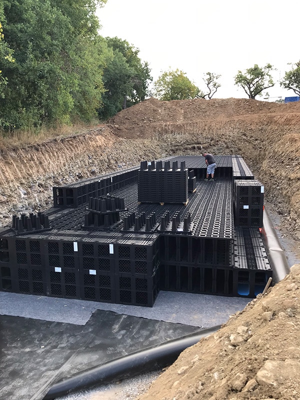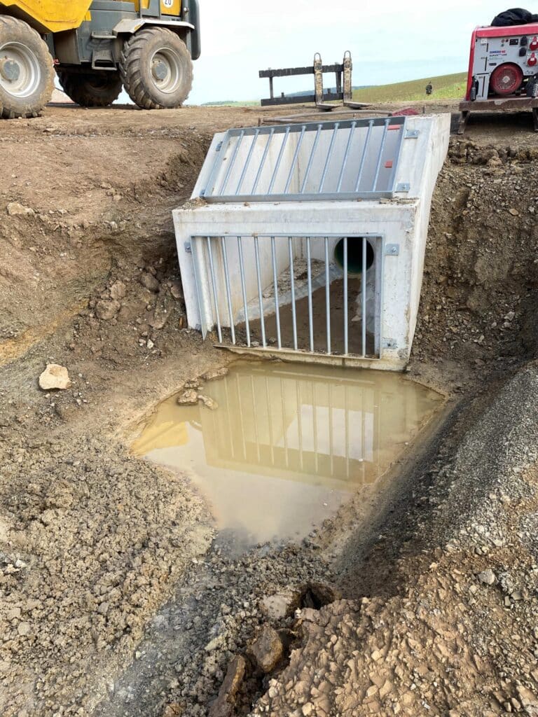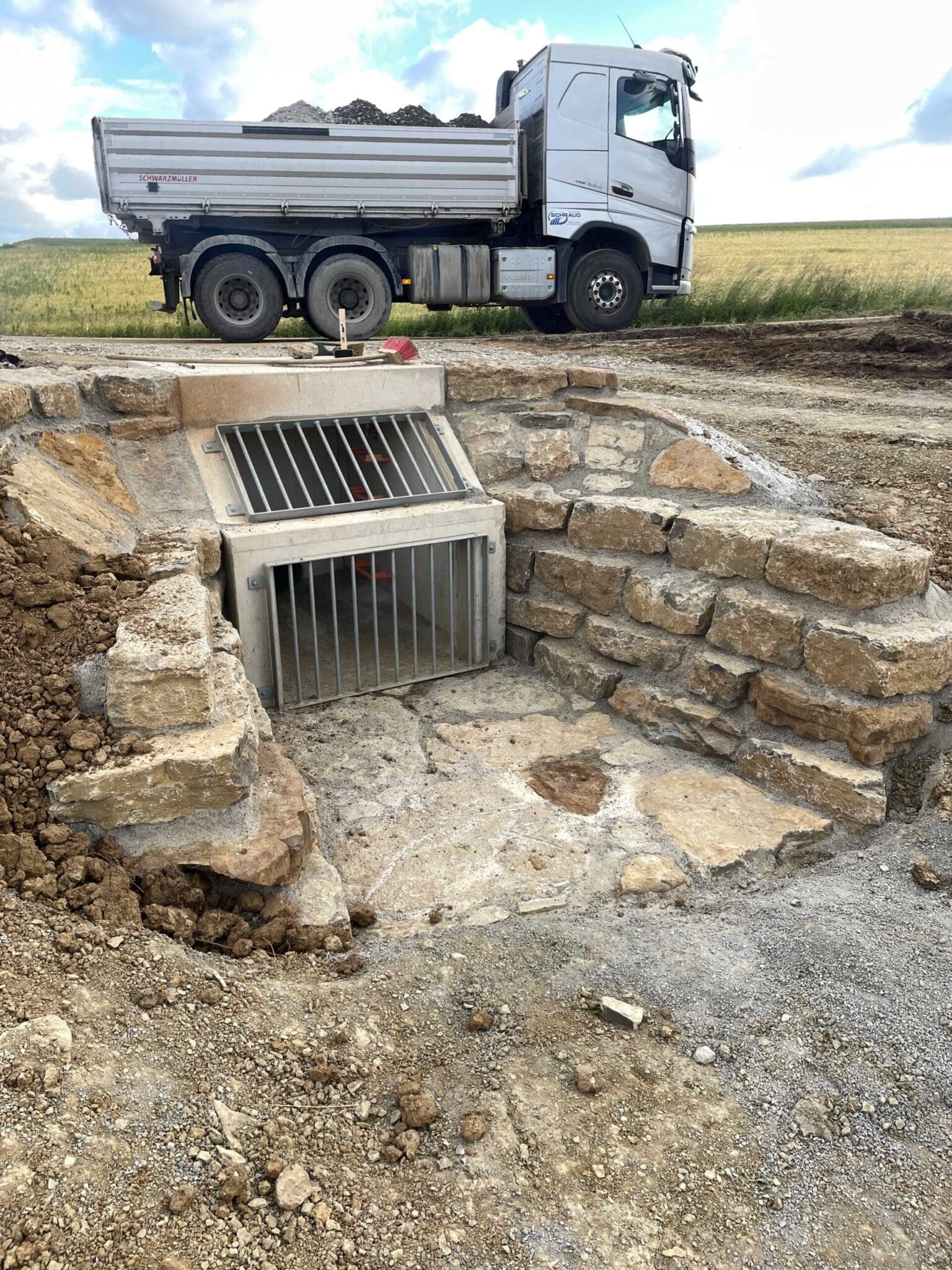 In diesen Tagen werden die entsprechenden Boxen versetzt, sowie mit einem Vlies und Folie eingepackt und verschweißt, die Anschlussleitungen verlegt und angeschlossen, das Bauwerk auf Dichtigkeit überprüft und die Baugrube wieder verfüllt.
