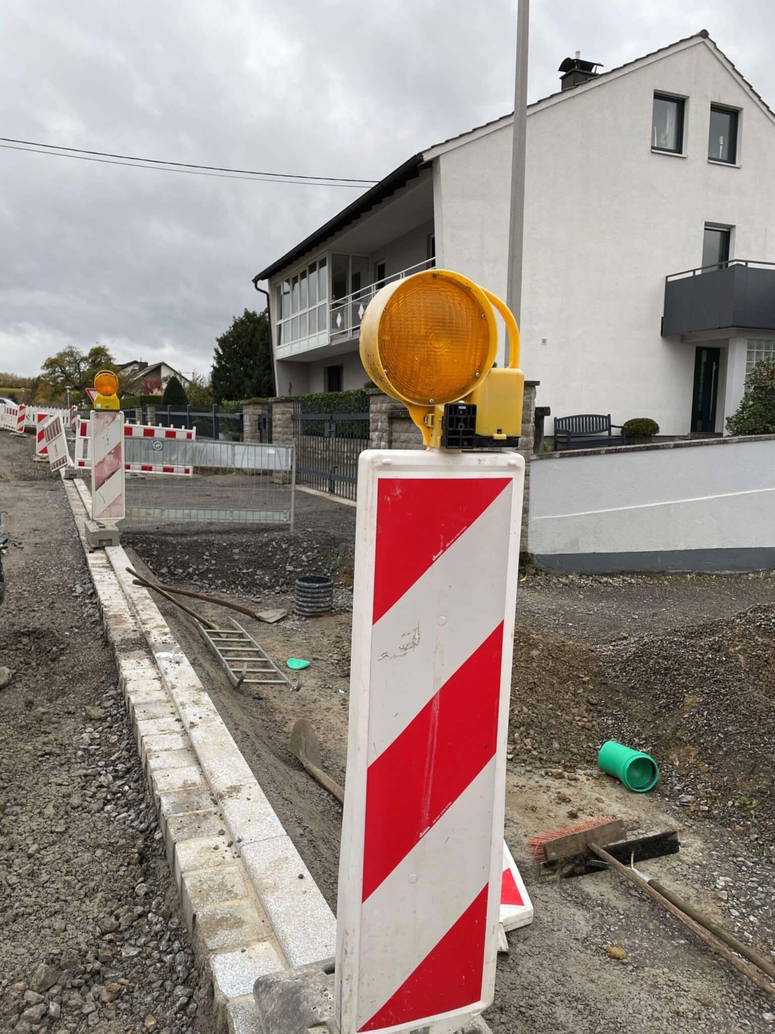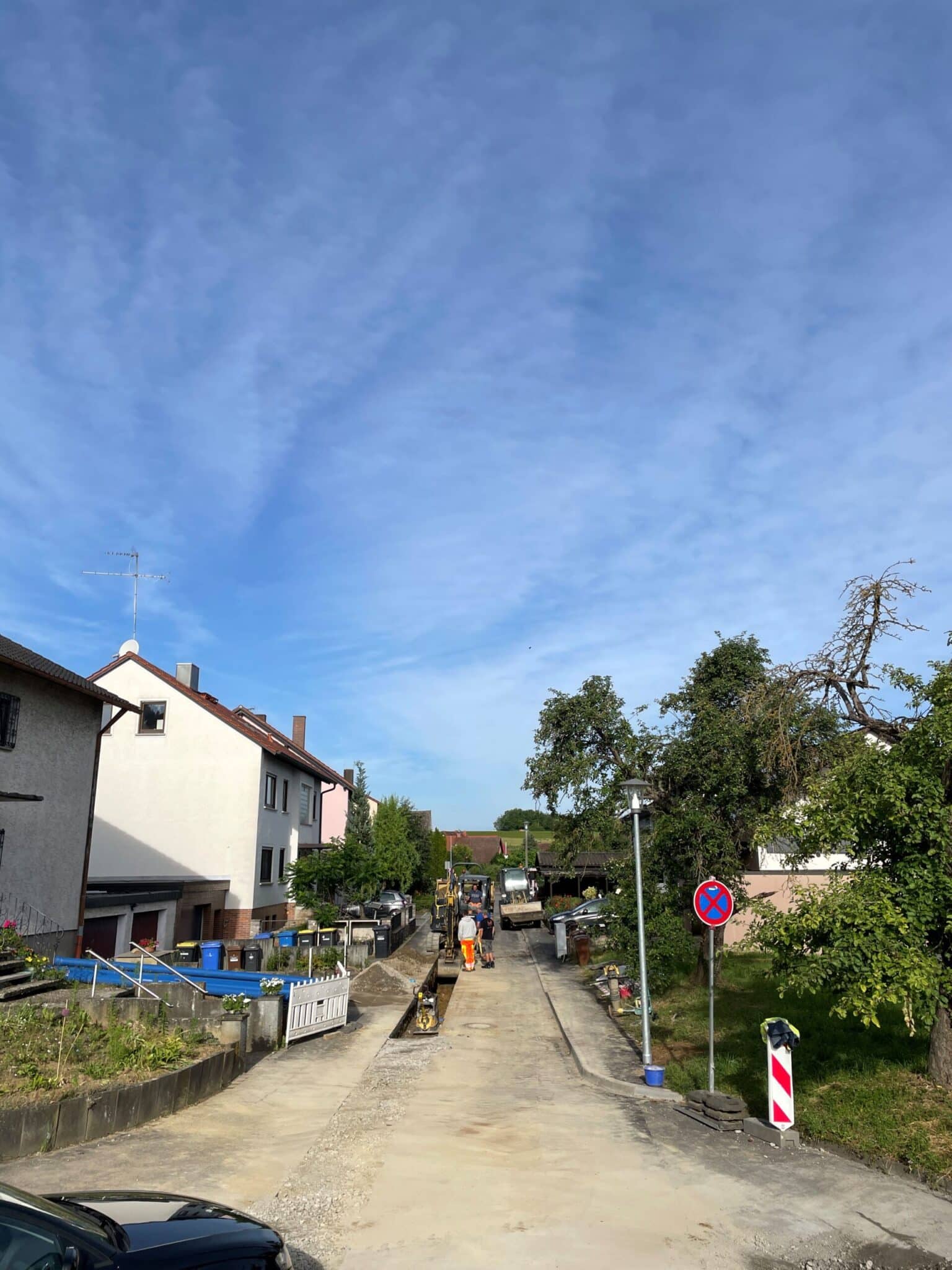 Momentan laufen die Arbeiten für die neue Erschließung des Feuerwehrhauses und an der Wasserleitung im Bereich der Einmündung Estenfelder Straße , als nächstes steht dann deren Querung für die Leitungsverlegung zur Straße „Am Baumland“ an.