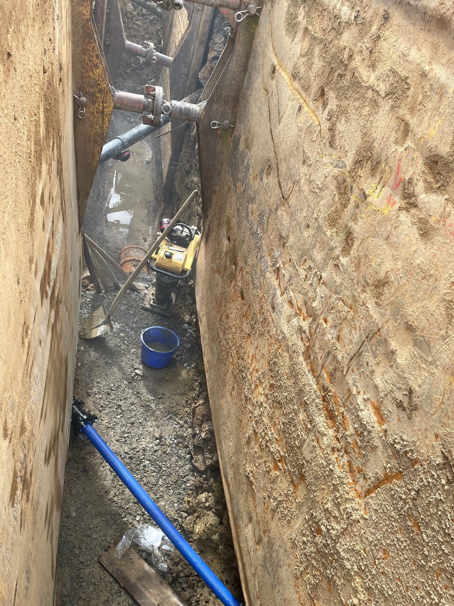 Die Kanalarbeiten in der zukünftigen Straße Bickelsgraben sind annähernd fertiggestellt, aktuell wird nun parallel die neue Wasserleitung verlegt.