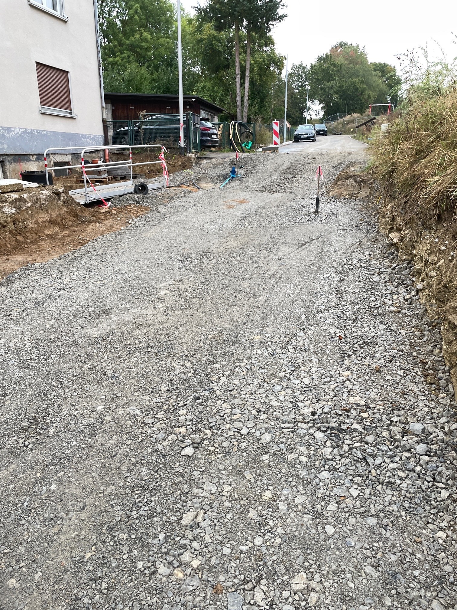 Die Rückbauarbeiten des ehem. Wirtschaftsweges sind fertiggestellt und die Kanalleitungen sind mittlerweile vom Mehlenweg hoch bis in die zukünftige Straße Bickelsgraben verlegt worden.
