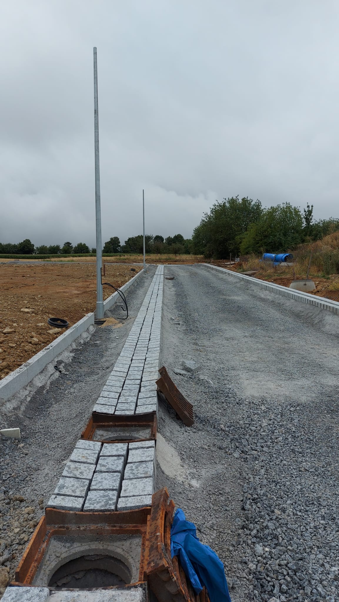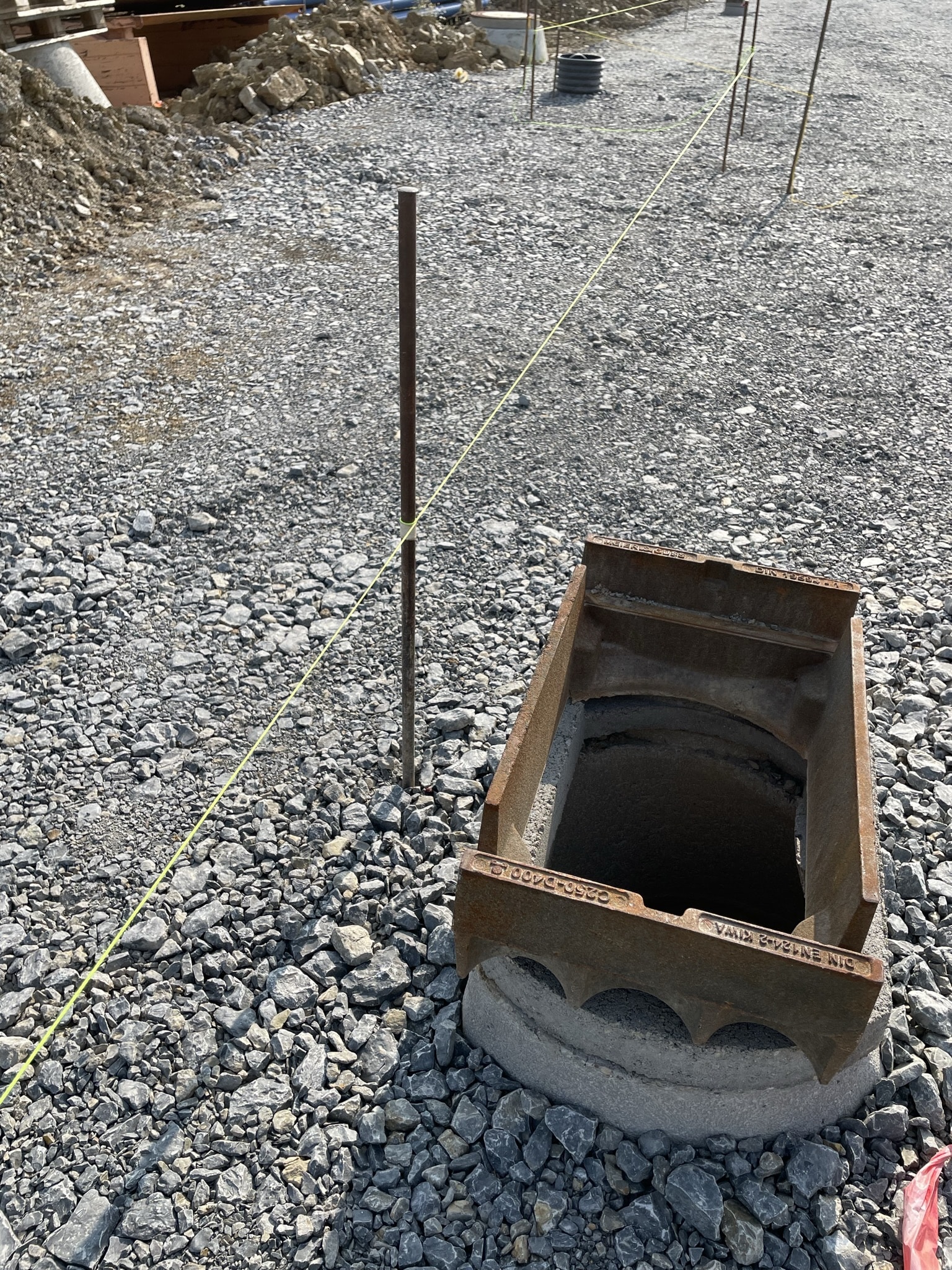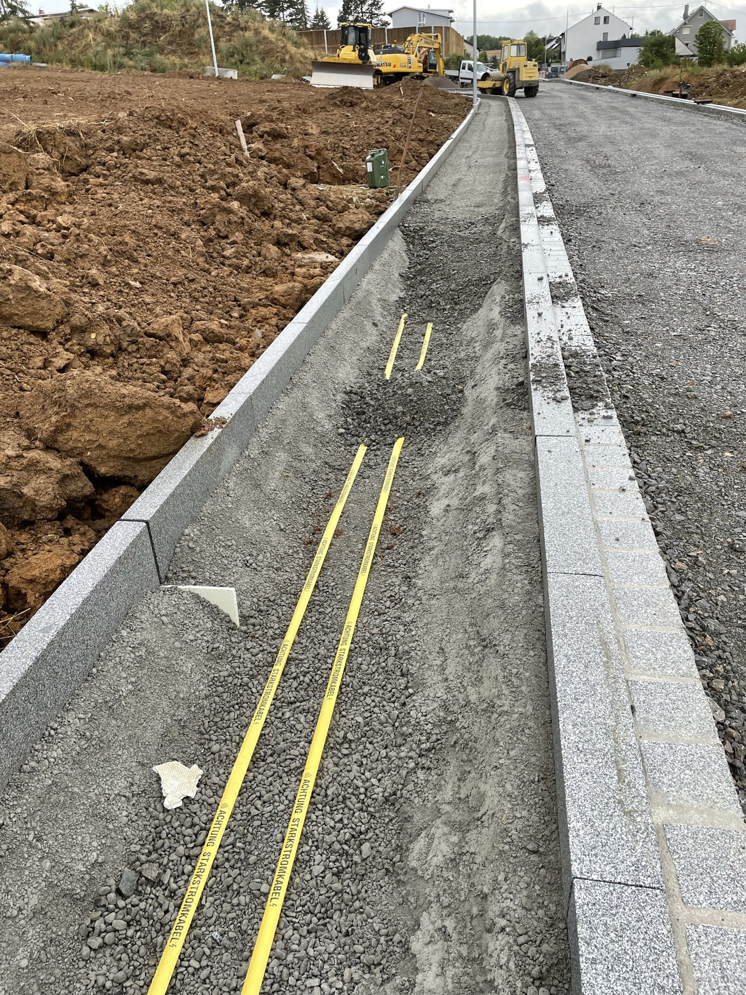 • Aktuell werden noch die letzten Straßeneinläufe hergestellt, anschließend die Kabelschutzrohre für Strom, Beleuchtung und Glasfaser verlegt