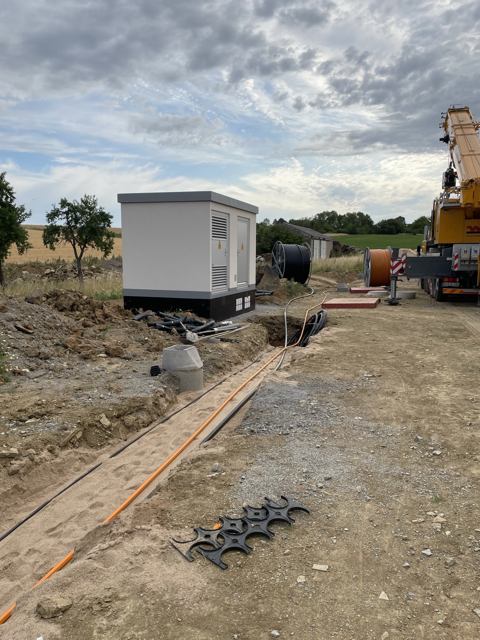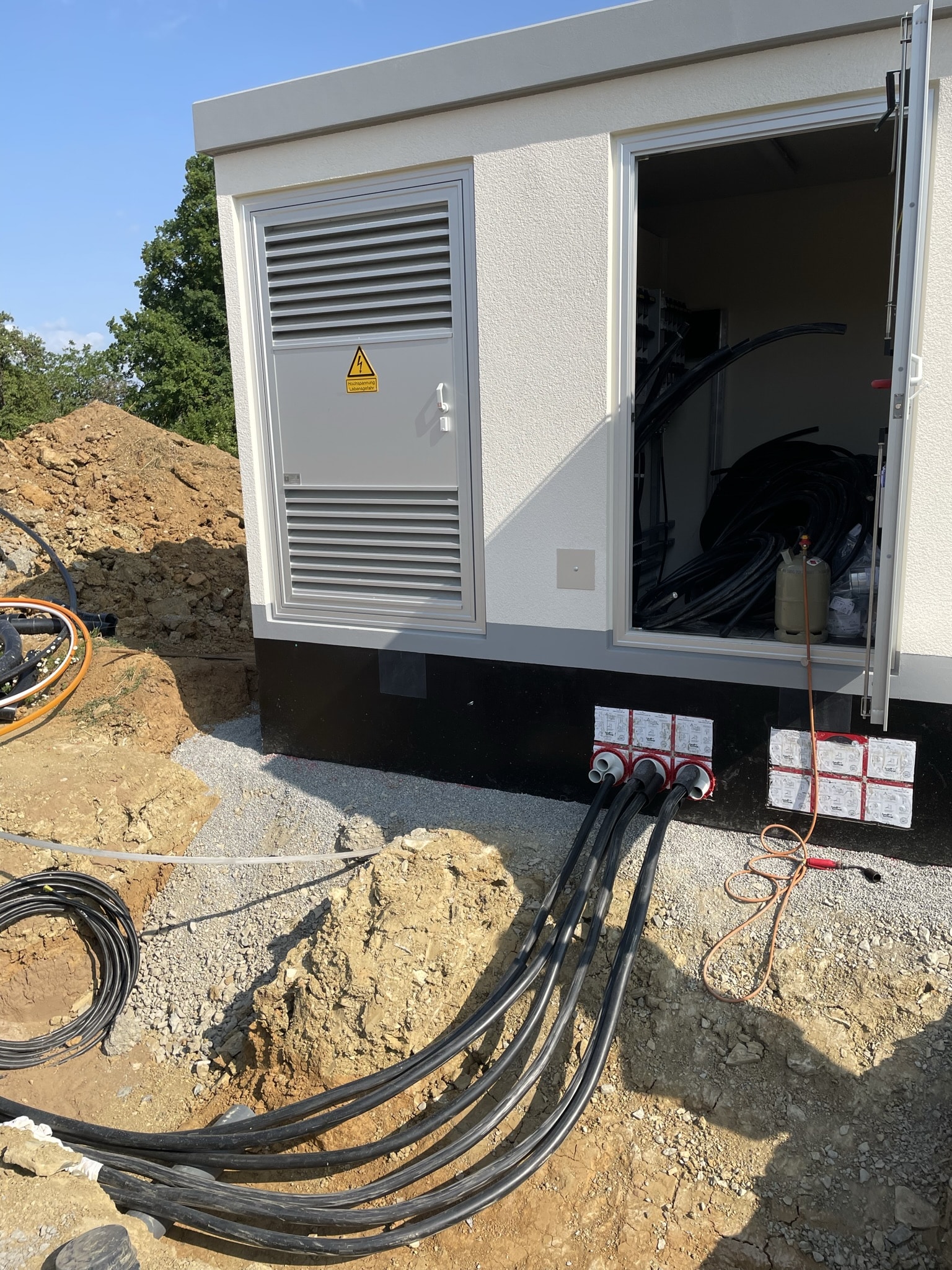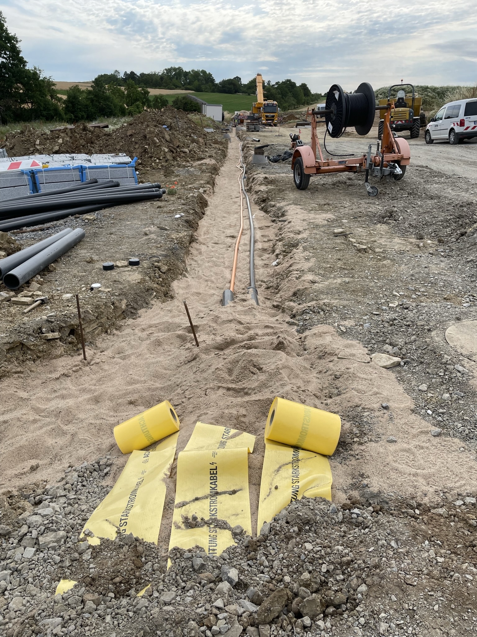 Zur Zeit erfolgen die Kabelarbeiten für Strom, Beleuchtung und Glasfaser, zudem wurde die Trafostation gestellt.