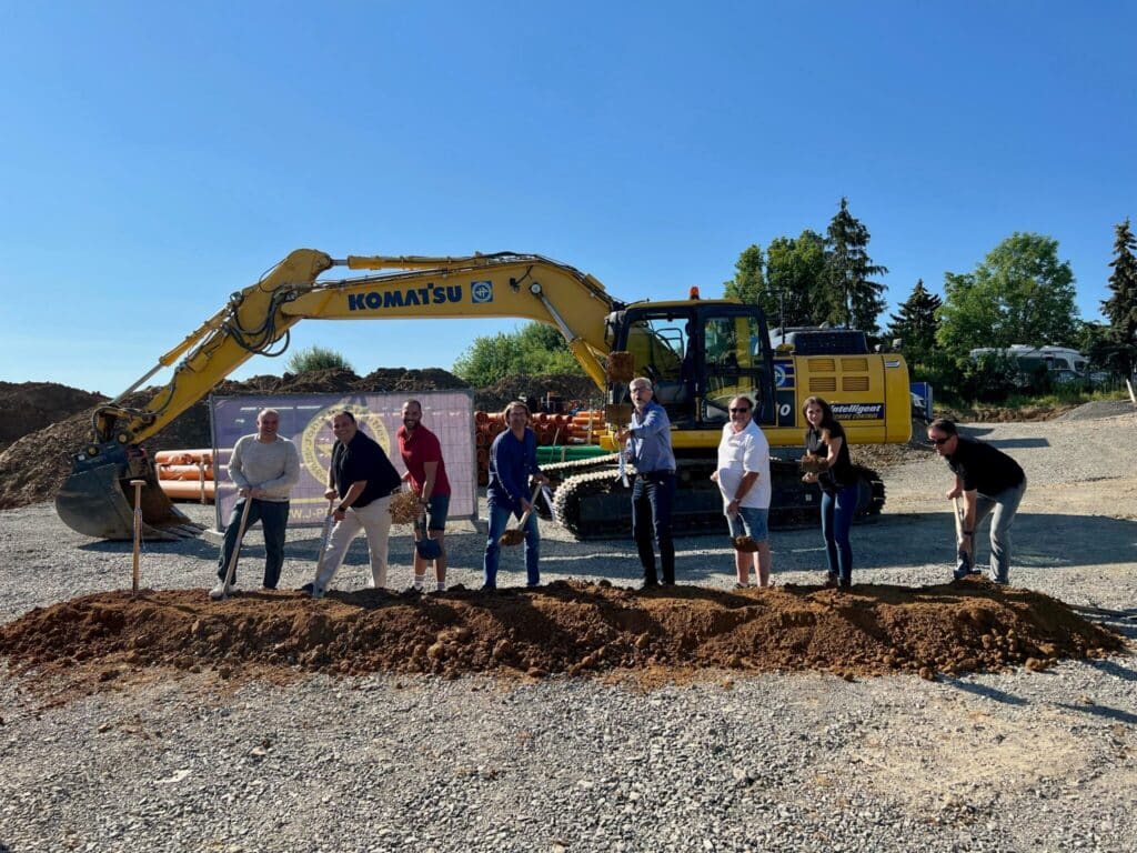 33 neue Bauplätze sollen im Neubaugebiet „Bickelsgraben“ im Rimparer Ortsteil Maidbronn entstehen. Auch ein Spielplatz mit dem Motto „Feuerwehr“ ist auf dem Areal am Ortseingang von Maidbronn geplant. Vor kurzem wurde mit der Schaffung von Baustelleneinrichtungs – und Lagerflächen und vorbereitenden Maßnahmen, wie dem Oberbodenabtrag, begonnen. Im Mehlenweg werden schon Kanalarbeiten durchgeführt und neue Schächte gesetzt – nun folgte der symbolische Spatenstich. Zu diesem trafen sich Bürgermeister Bernhard Weidner, Marco Göbet (Leiter Fachbereich Planen und Bauen), Oliver Werner (Fachbereich Planen und Bauen), Alexander Kempf (IB Köhl). Michael Löhe (IB Köhl), Matthias Henfling (BayernGrund), Guido Engelskirchen (Fa. Pfeuffer) und Nina Kießling (Fa. Pfeuffer).