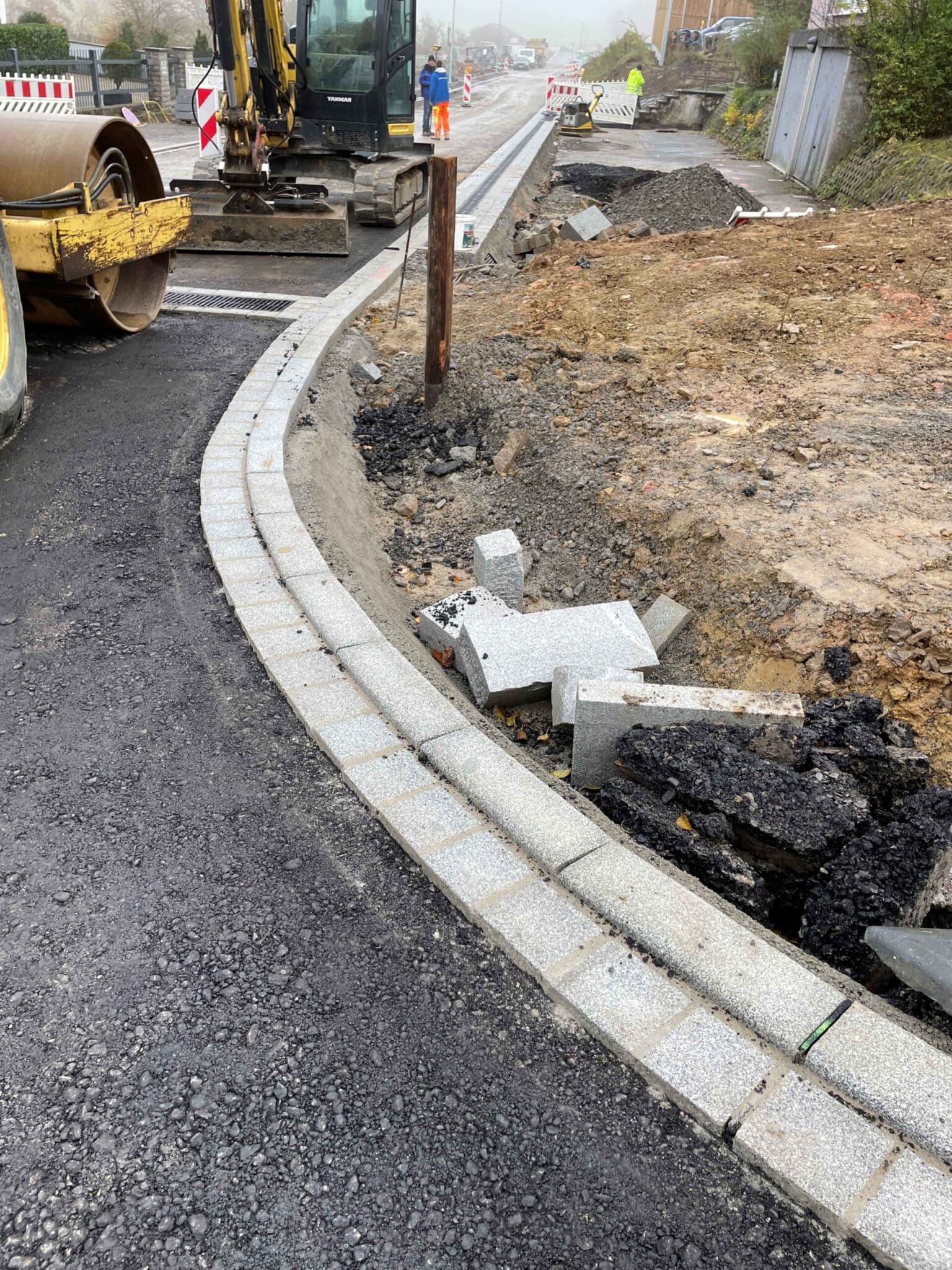 Im Mehlenweg werden gerade die letzten Arbeiten am Unterbau und an den Randeinfassungen getätigt, bevor dann am kommenden Donnerstag die Asphalttragschicht eingebaut wird.