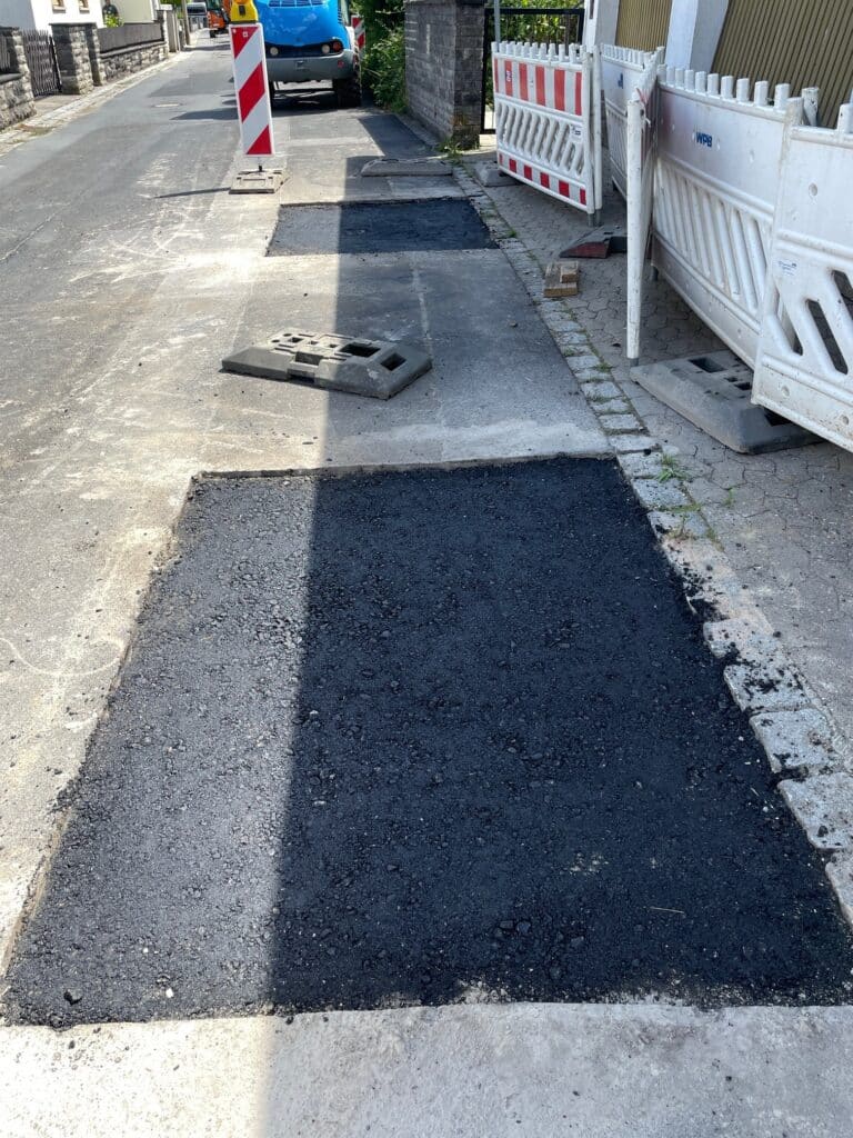 Nachdem die Baustelleneinrichtung hergestellt wurde, hat die Fa. WPB begonnen, die Asphaltdecke der Gruben aufzubrechen, während die Fa. ROTEC dabei ist, die Wasser-Notversorgung aufzubauen.