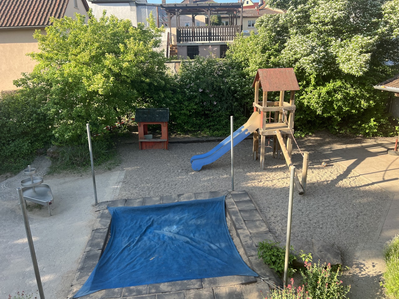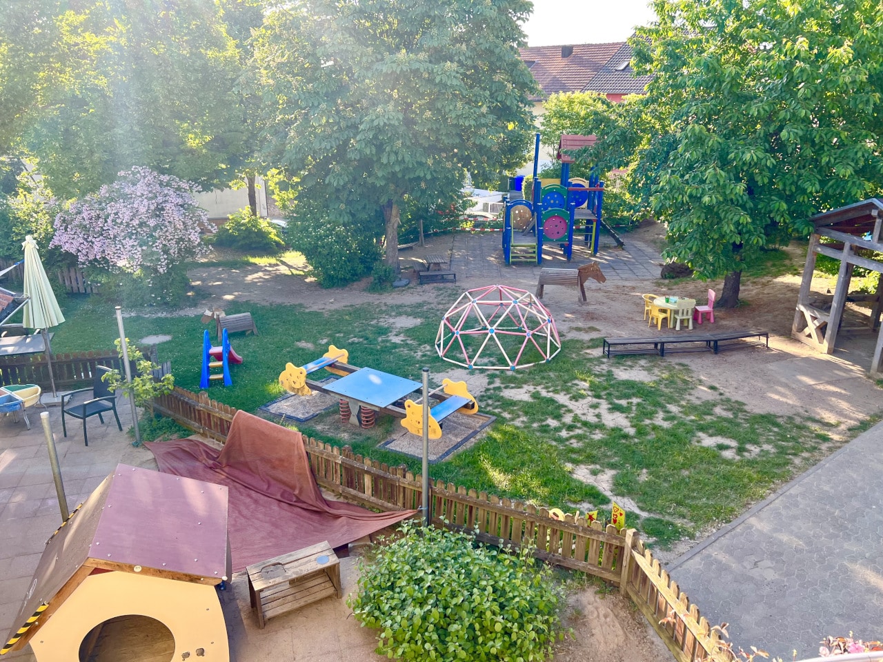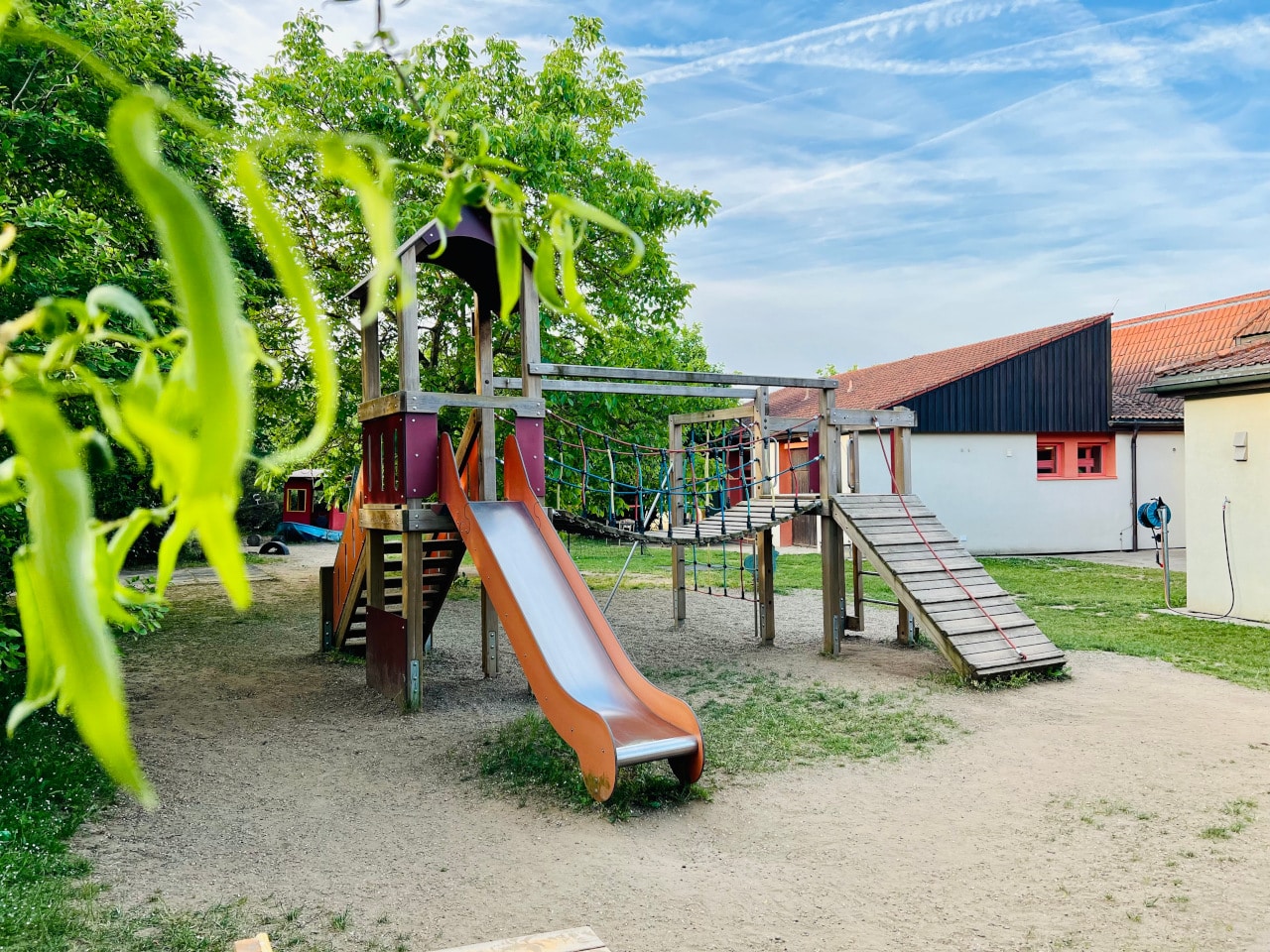 Hinter dem Gebäude steht den Kindern ein schöner Außenspielbereich zur Verfügung, der zum Toben, Buddeln und Klettern einlädt.
