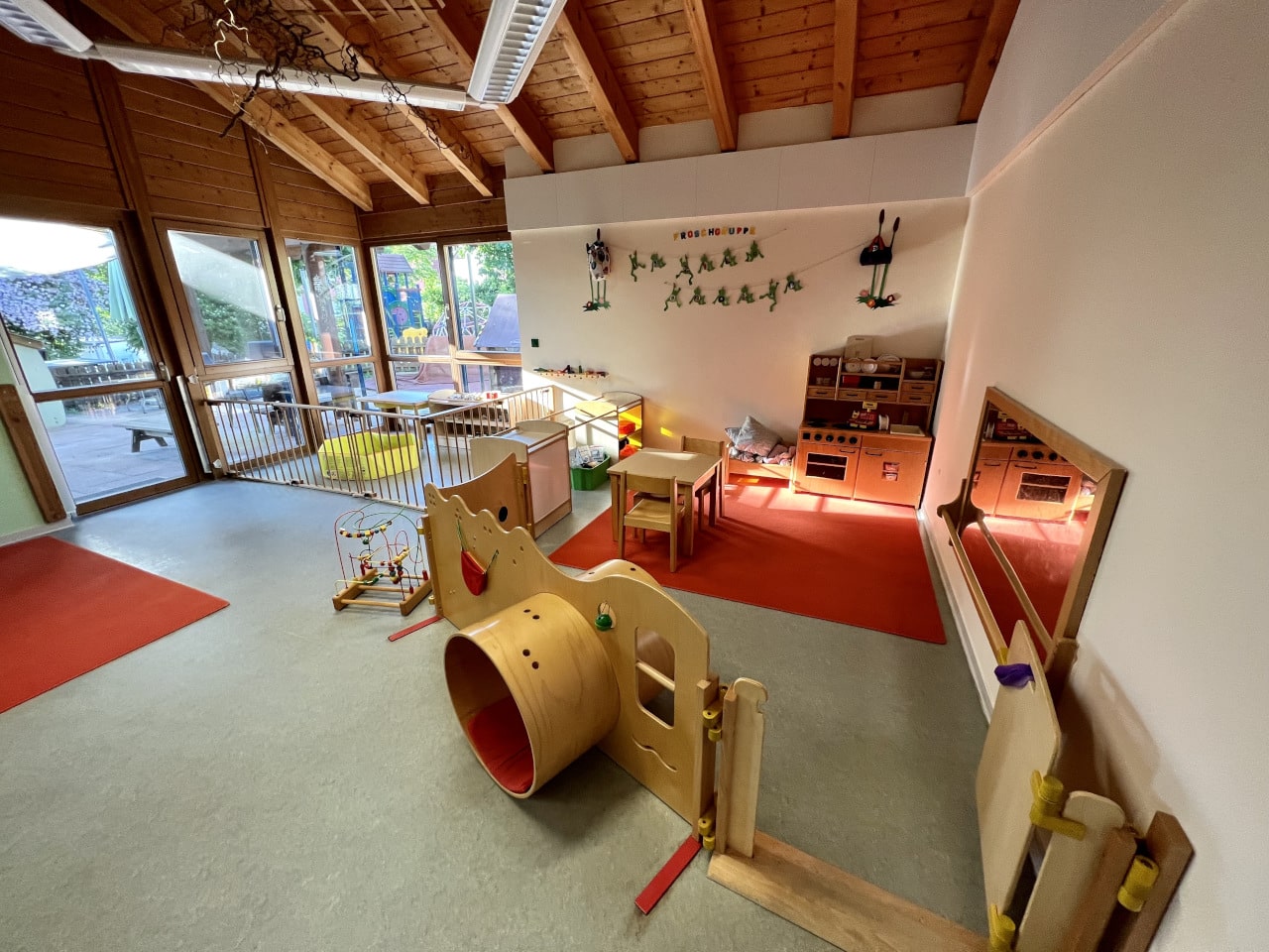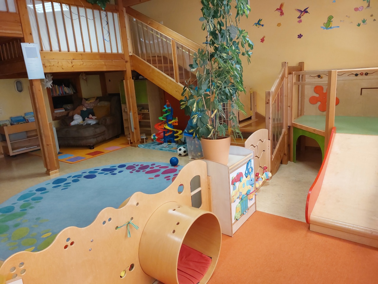 Im Erdgeschoss ist der Bereich der Krippenkinder. Die Krippengruppen „Lurche“ und „Libellen“ haben jeweils einen Gruppenraum, einen Schlafraum, ein Bad mit Wickelraum und eine Garderobe. Der große Flur im Eingangsbereich ist für unsere Kleinsten interessant und abwechslungsreich gestaltet, sodass hier verschiedene Spielmöglichkeiten geboten werden.