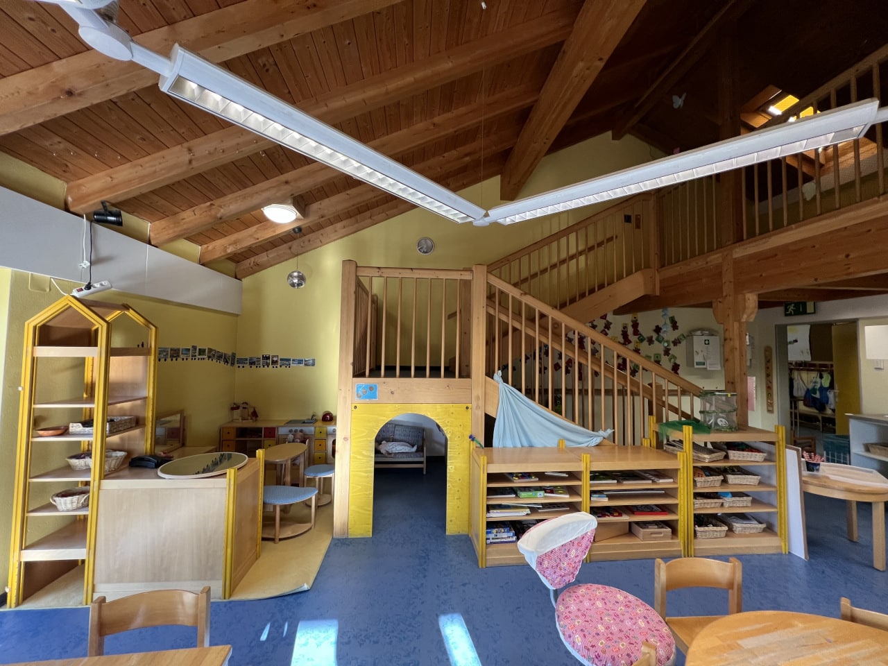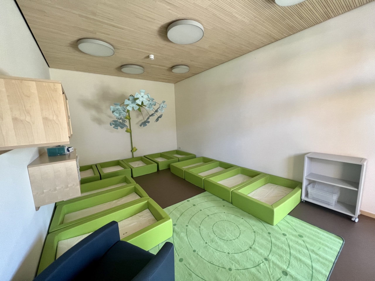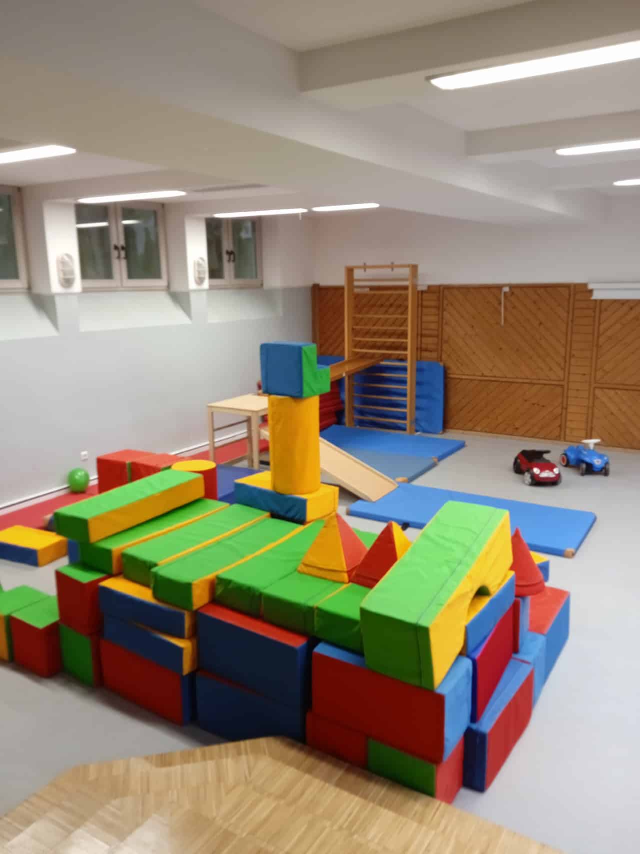 Im ersten Stock befindet sich zudem noch ein großer Turnraum, den alle Kinder für Bewegungsstunden und Bewegungsbaustellen nutzen können.