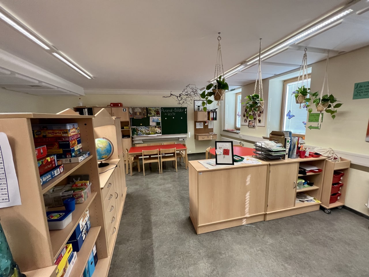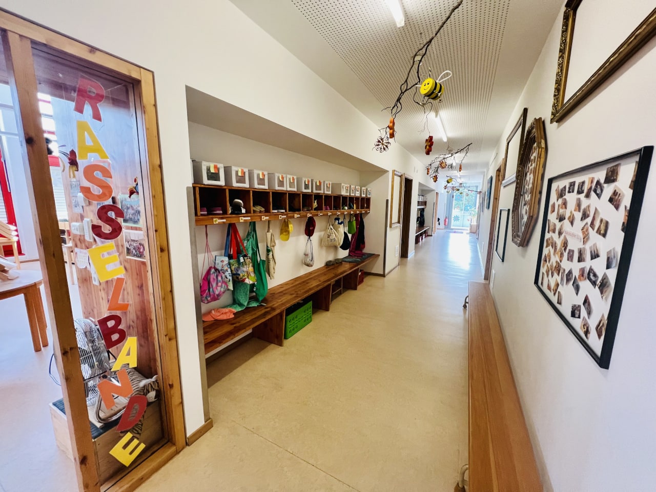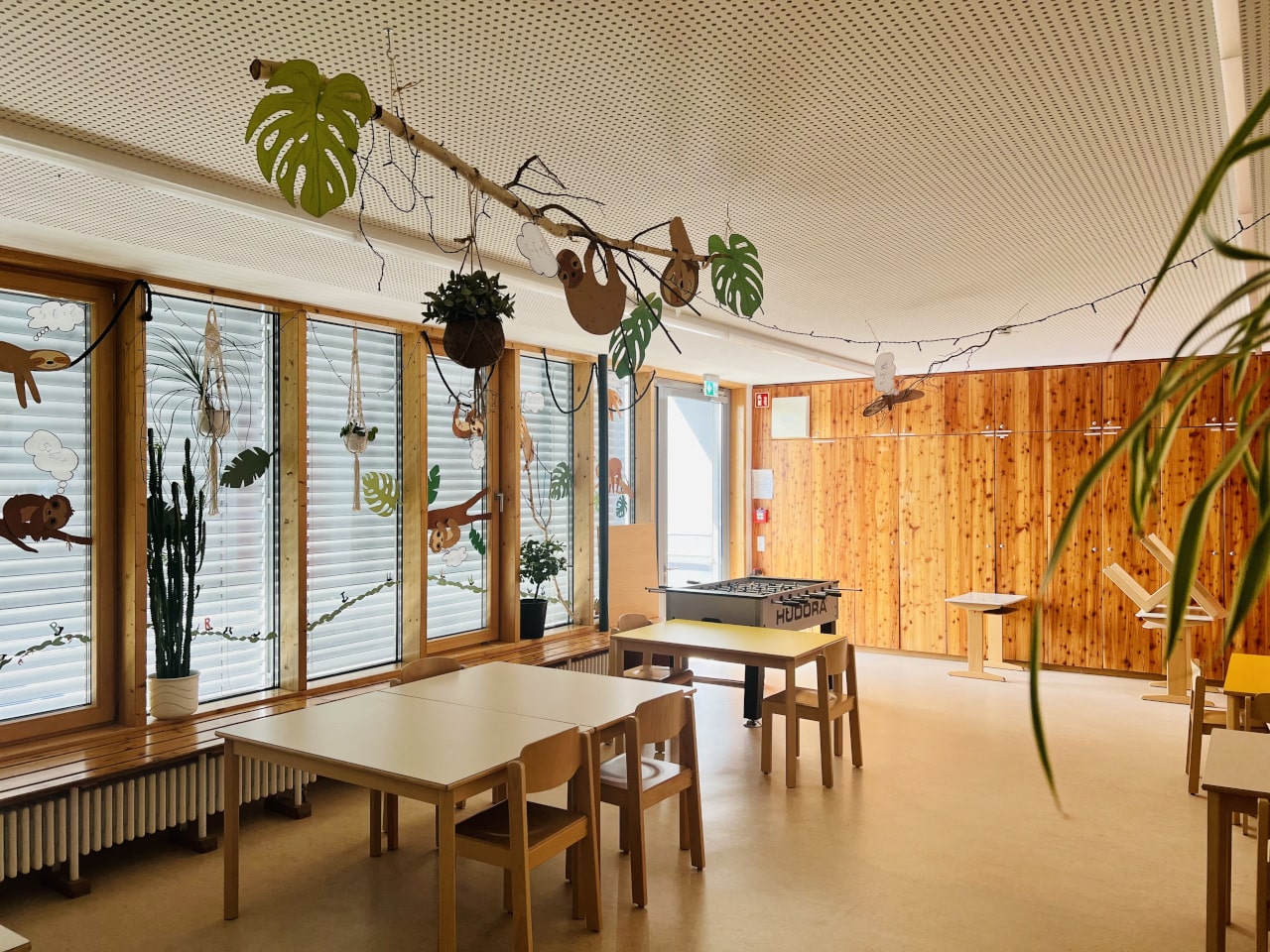 Im ersten Stock befindet sich zudem noch ein großer Turnraum, den alle Kinder für Bewegungsstunden und Bewegungsbaustellen nutzen können.