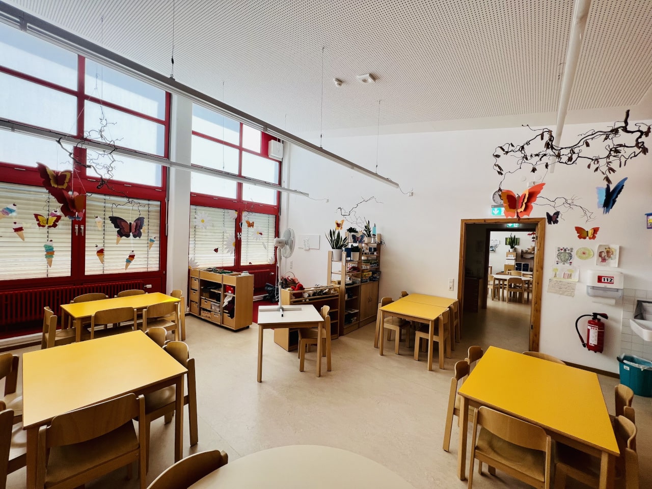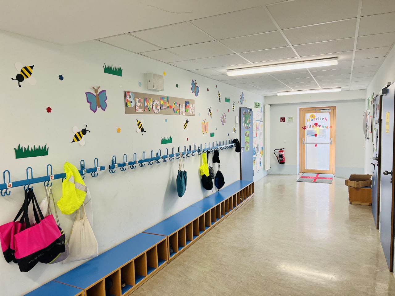 Die Räumlichkeiten der Mittagsbetreuung befinden sich im Untergeschoss der Grundschule. Darüber hinaus werden auch die Außenanlage der Schule mitgenutzt.
