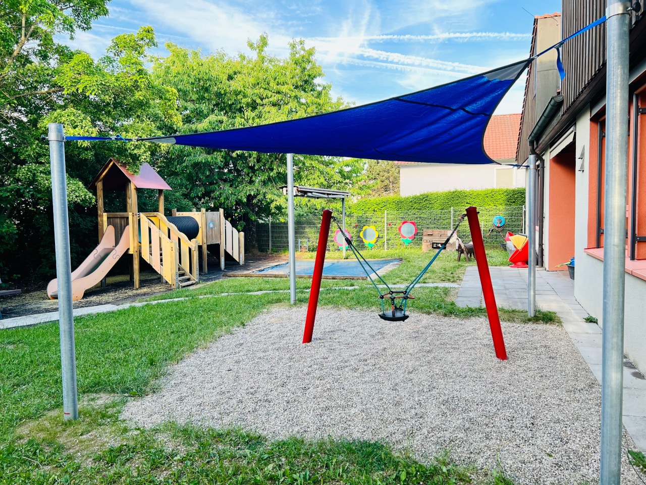 Etwas versteckt liegt hinter unserem Kinderhort eine kleine grüne Außenspielfläche, die im Oktober 2020 verschönert wurde. Insbesondere für die Erst- und Zweitklässler bietet dieser Spielplatz die Möglichkeit direkt nach der Schule draußen zu spielen, da wir in dieser Zeit den Pausenhof nicht nutzen können. Bestückt mit einem Klettergerüst, einer Nestschaukel und einem schönen Sandkasten mit Sonnenschutz