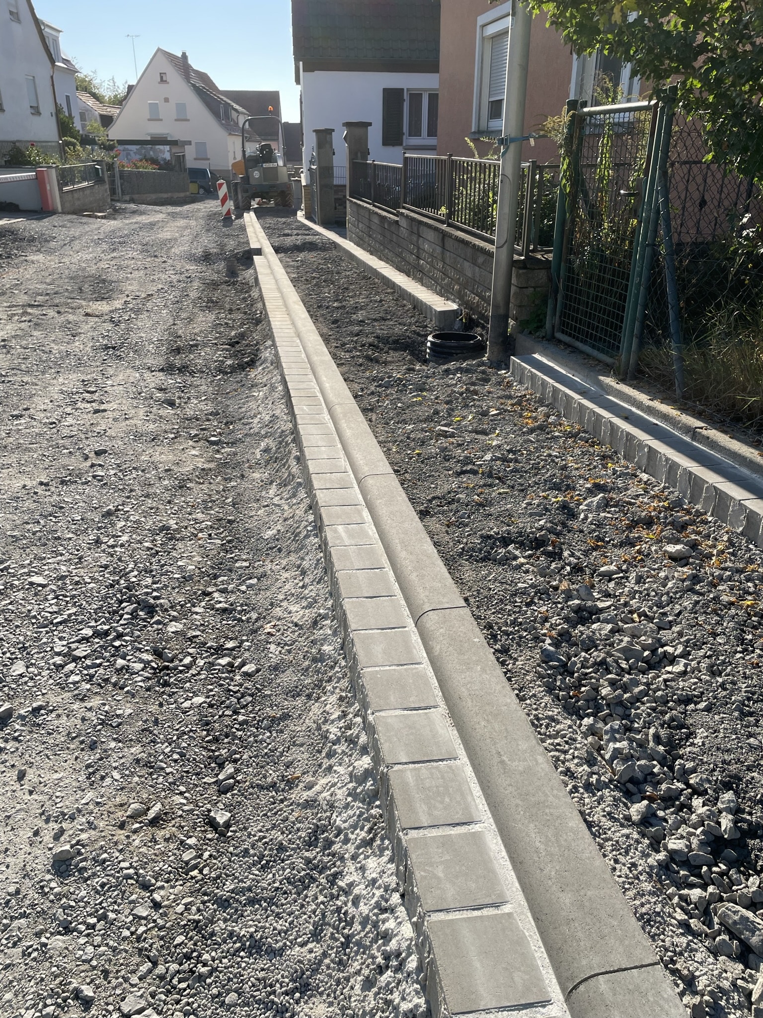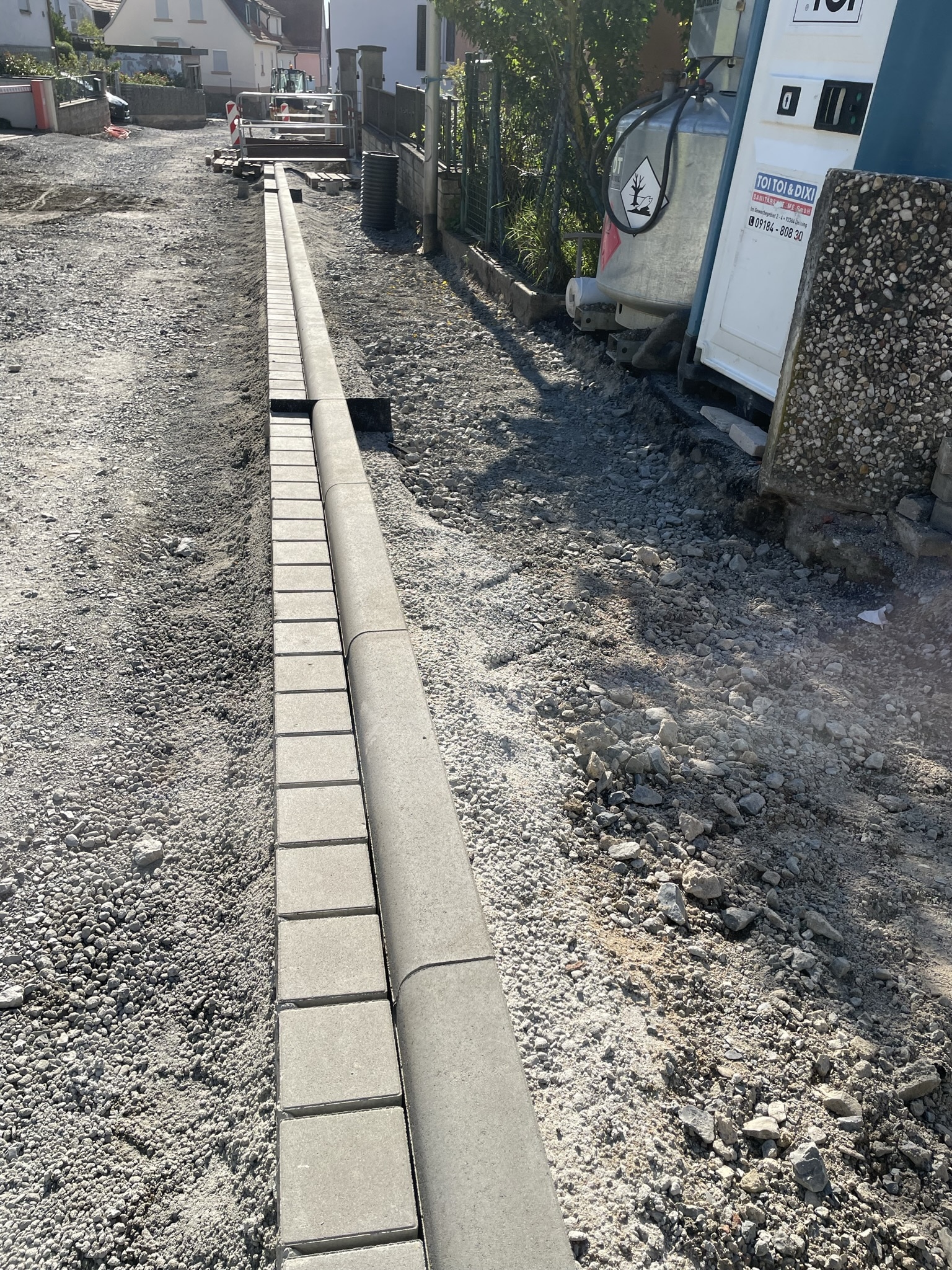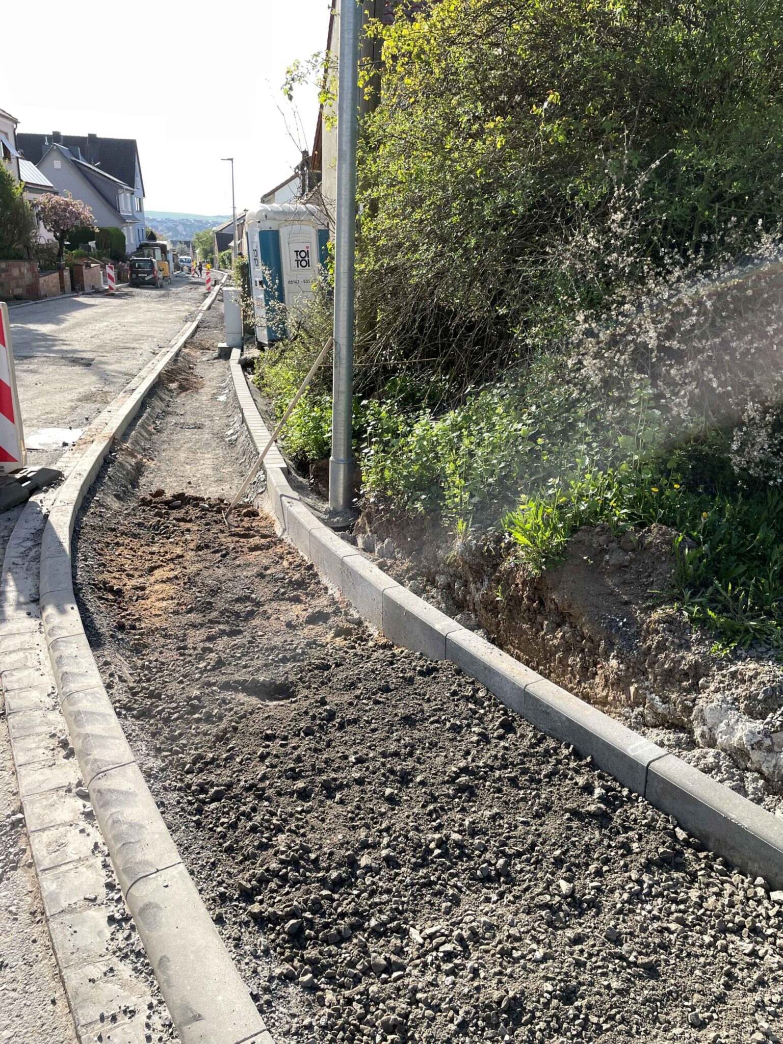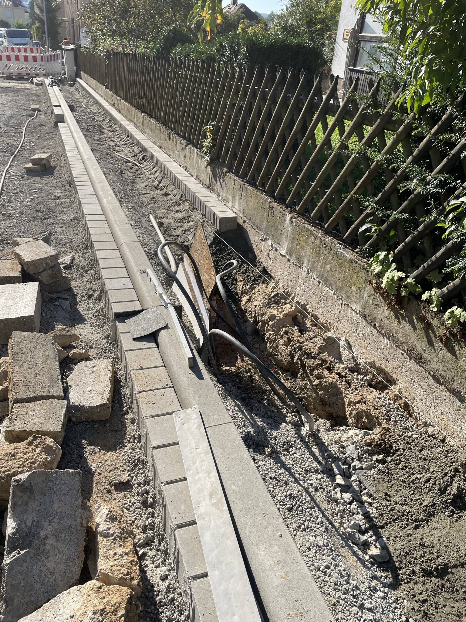 Die Randeinfassungen des Gehwegs (Bordstein mit Einzeiler bzw. nur Einzeiler Grundstück seitig) sind bis auf die Aussparungen für Straßeneinläufe, Beleuchtungsmasten, etc. bis ca. Anwesen Hs.Nr.30 gesetzt.