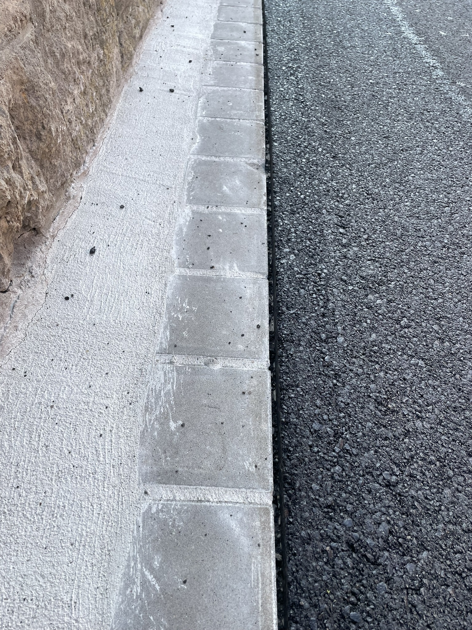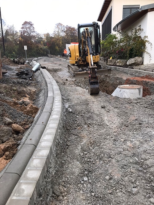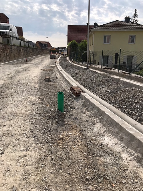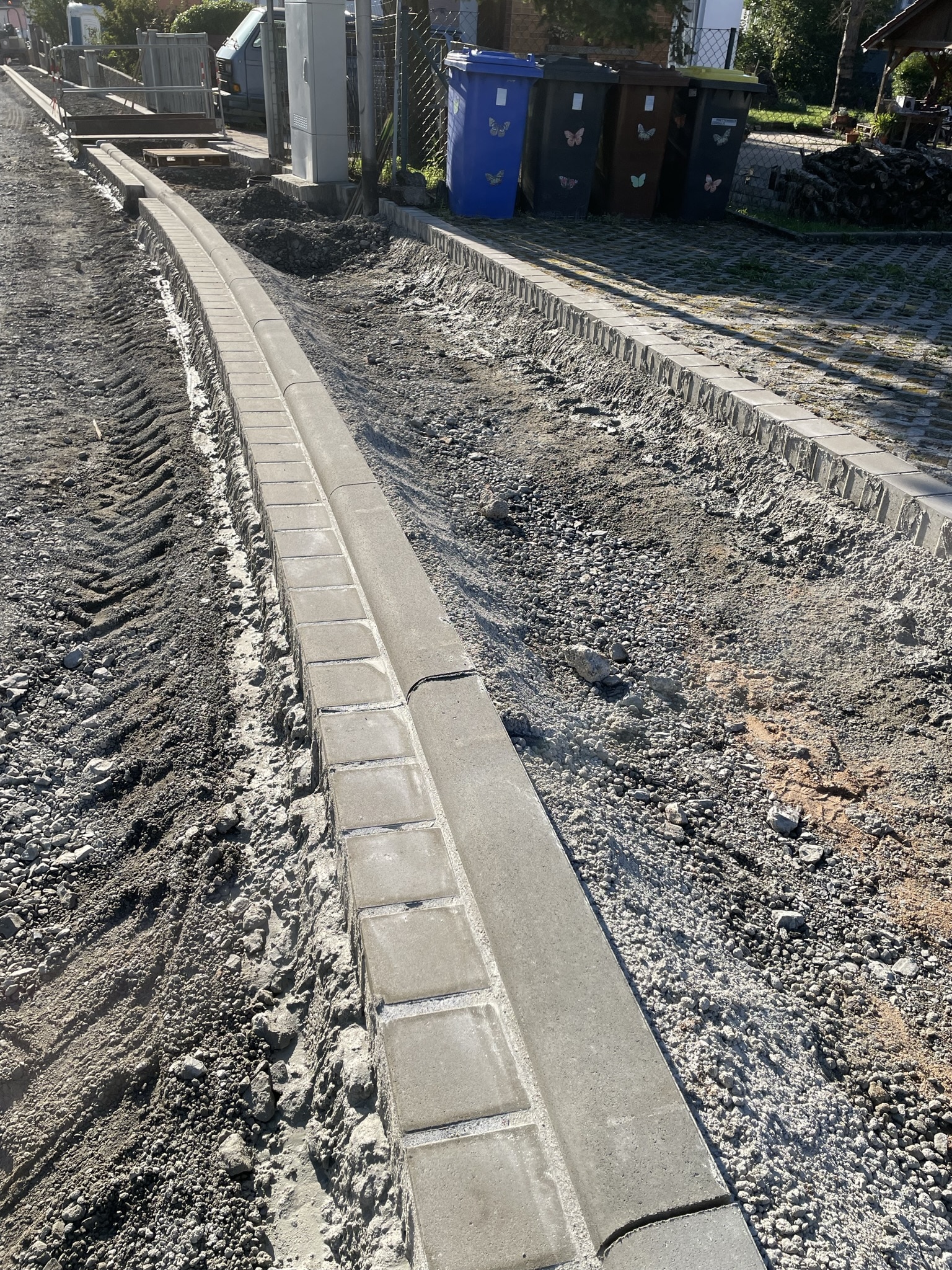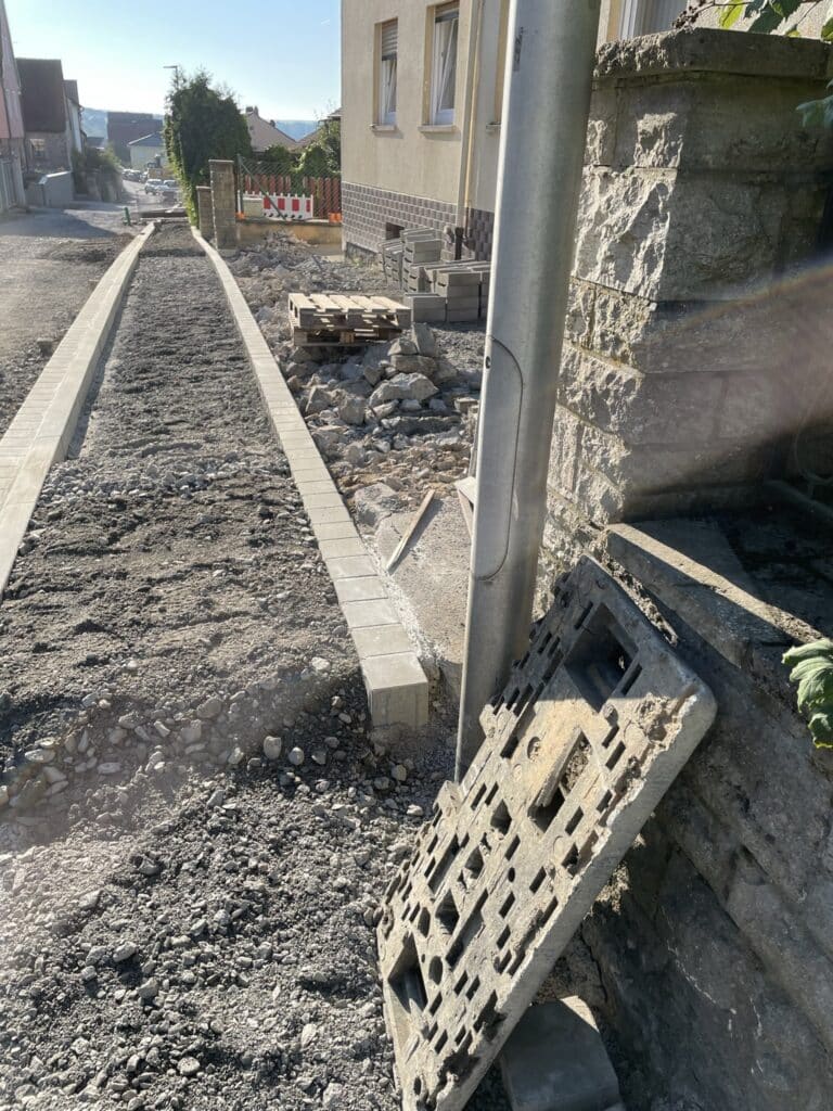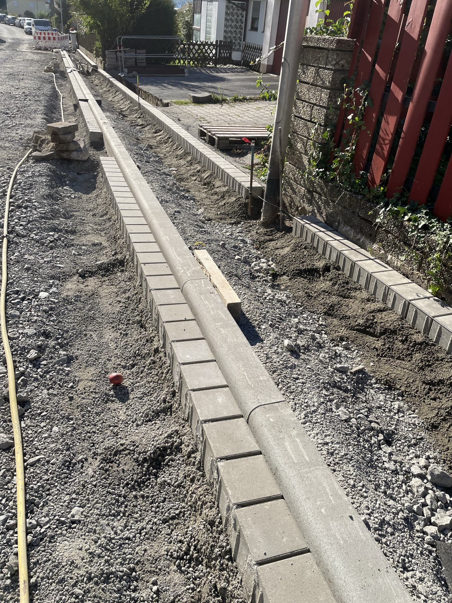 Die Randeinfassungen des Gehwegs (Bordstein mit Einzeiler bzw. nur Einzeiler Grundstück seitig) sind bis auf die Aussparungen für Straßeneinläufe, Beleuchtungsmasten, etc. bis ca. Anwesen Hs.Nr.30 gesetzt.