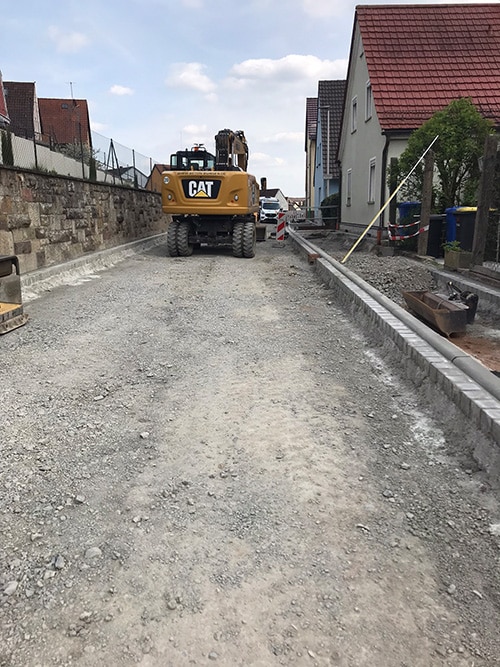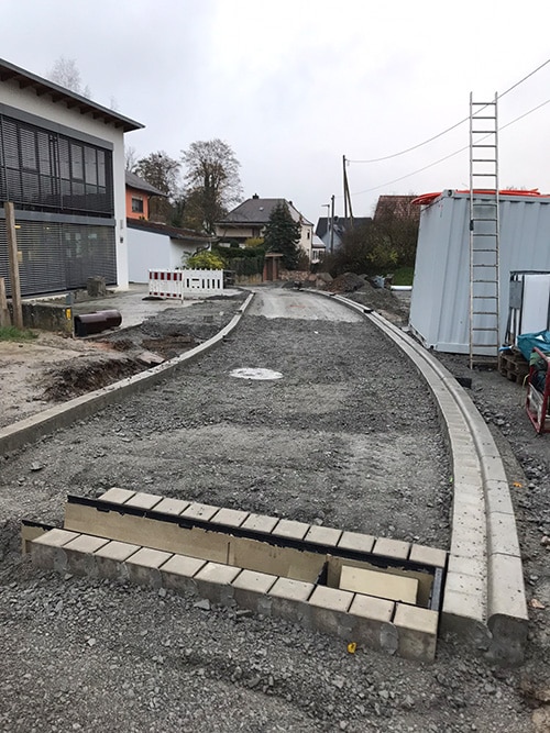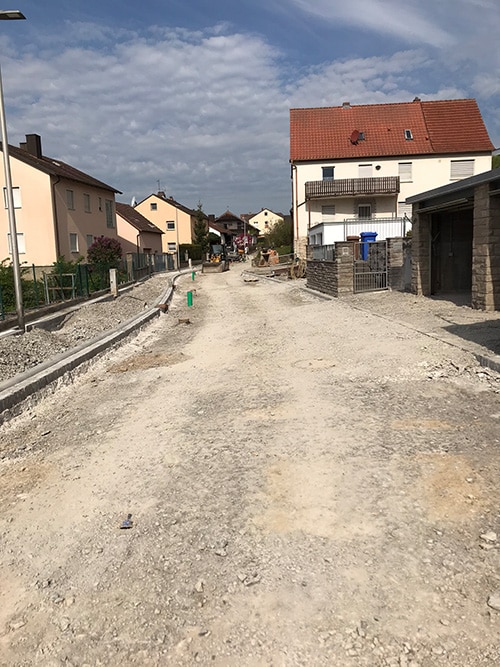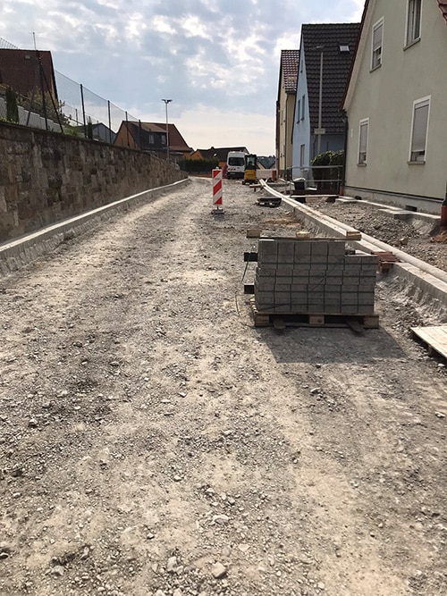 Aktuell wird die Frostschutzschicht des Gehwegs hergestellt bzw. die Grundstückszugänge aufgeschottert.