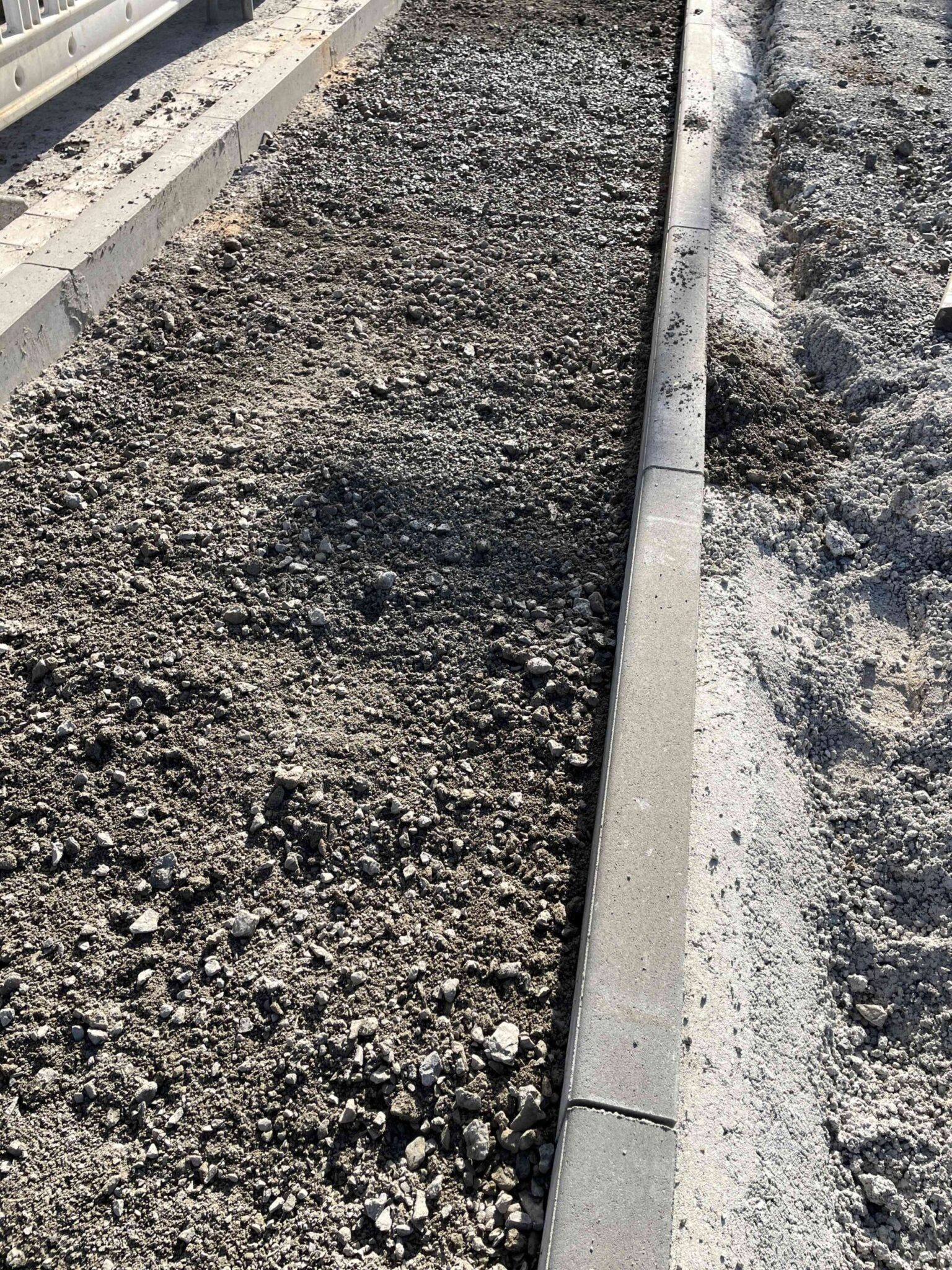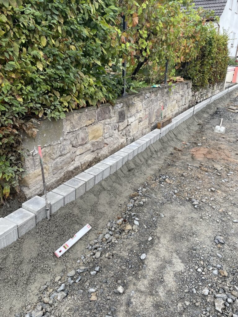 Weiterhin wird parallel die Bordsteinflucht und -höhe abgesteckt und das Planum entsprechend hergestellt, so dass im Laufe der Woche eine zusätzliche Kolonne mit dem Setzen der Randeinfassungen beginnen kann.