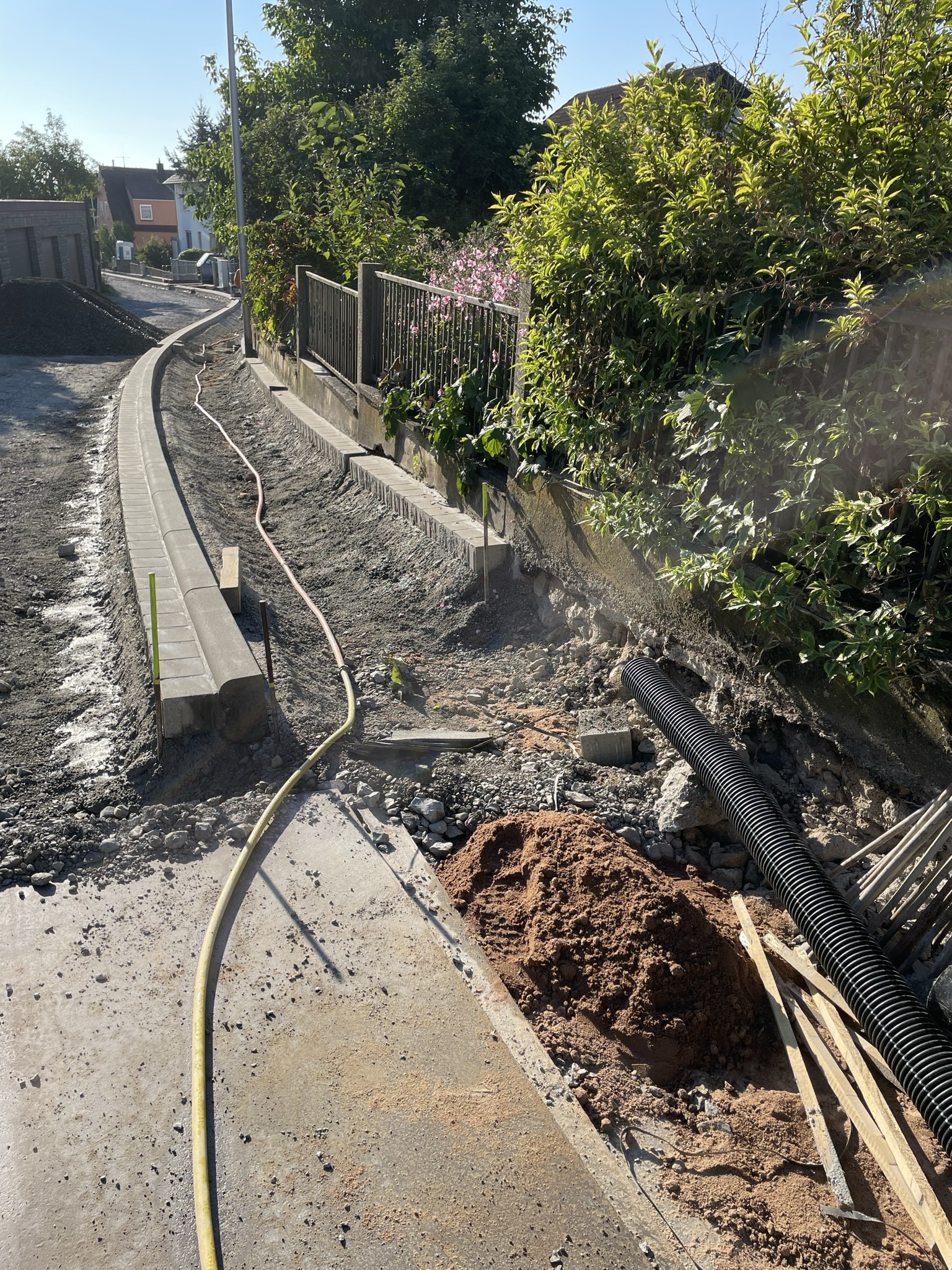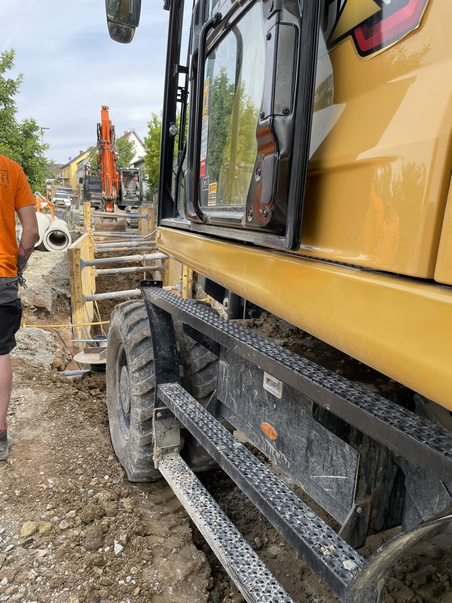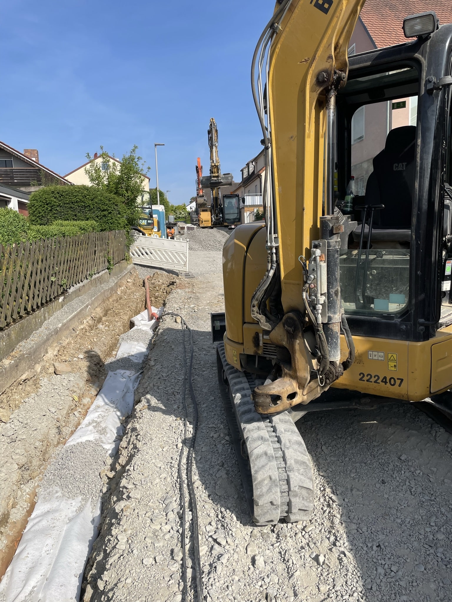 Wir sind aktuell mit dem Gemeinschaftsgraben für Wasser, Kanal, Strom, Beleuchtung, Telekom und Glasfaser auf Höhe Haus Nr. 52a.