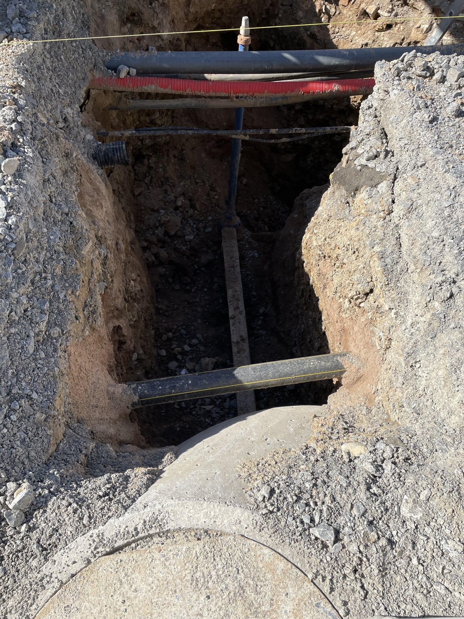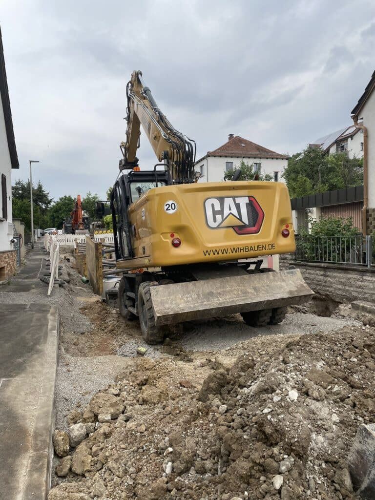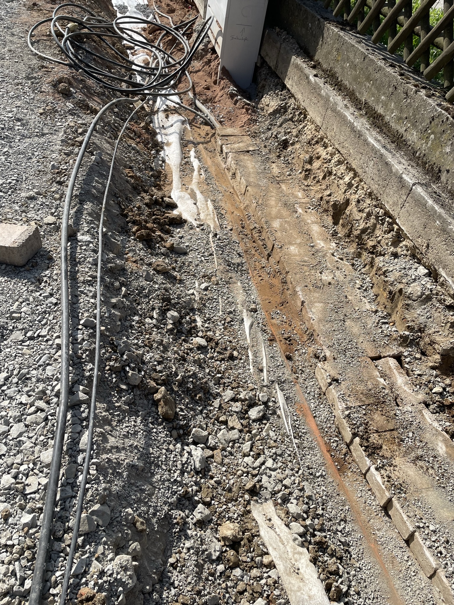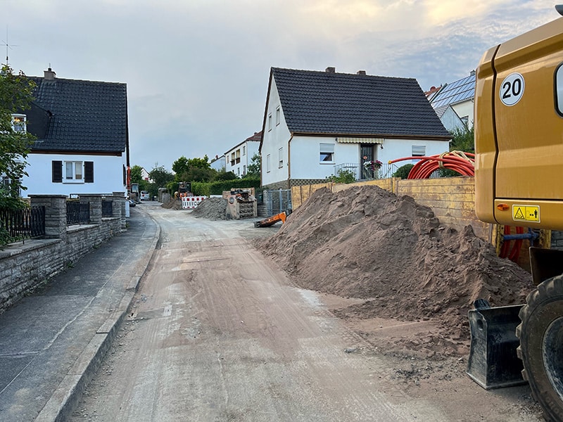 Wir sind aktuell mit dem Gemeinschaftsgraben für Wasser, Kanal, Strom, Beleuchtung, Telekom und Glasfaser auf Höhe Haus Nr. 52a.
