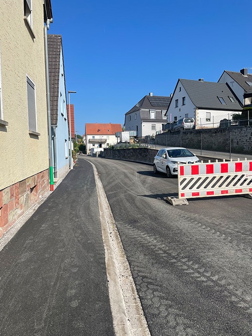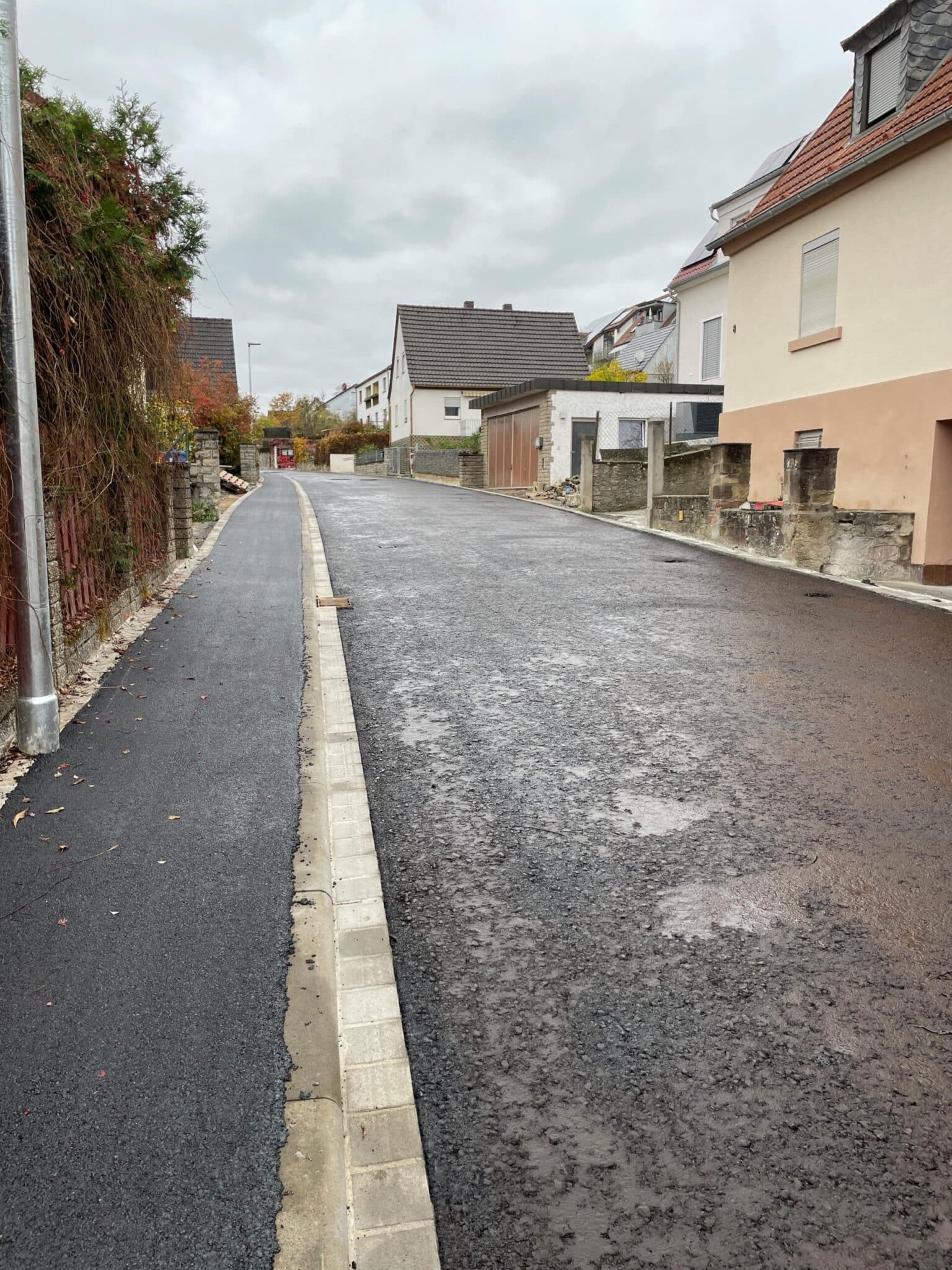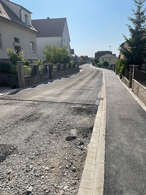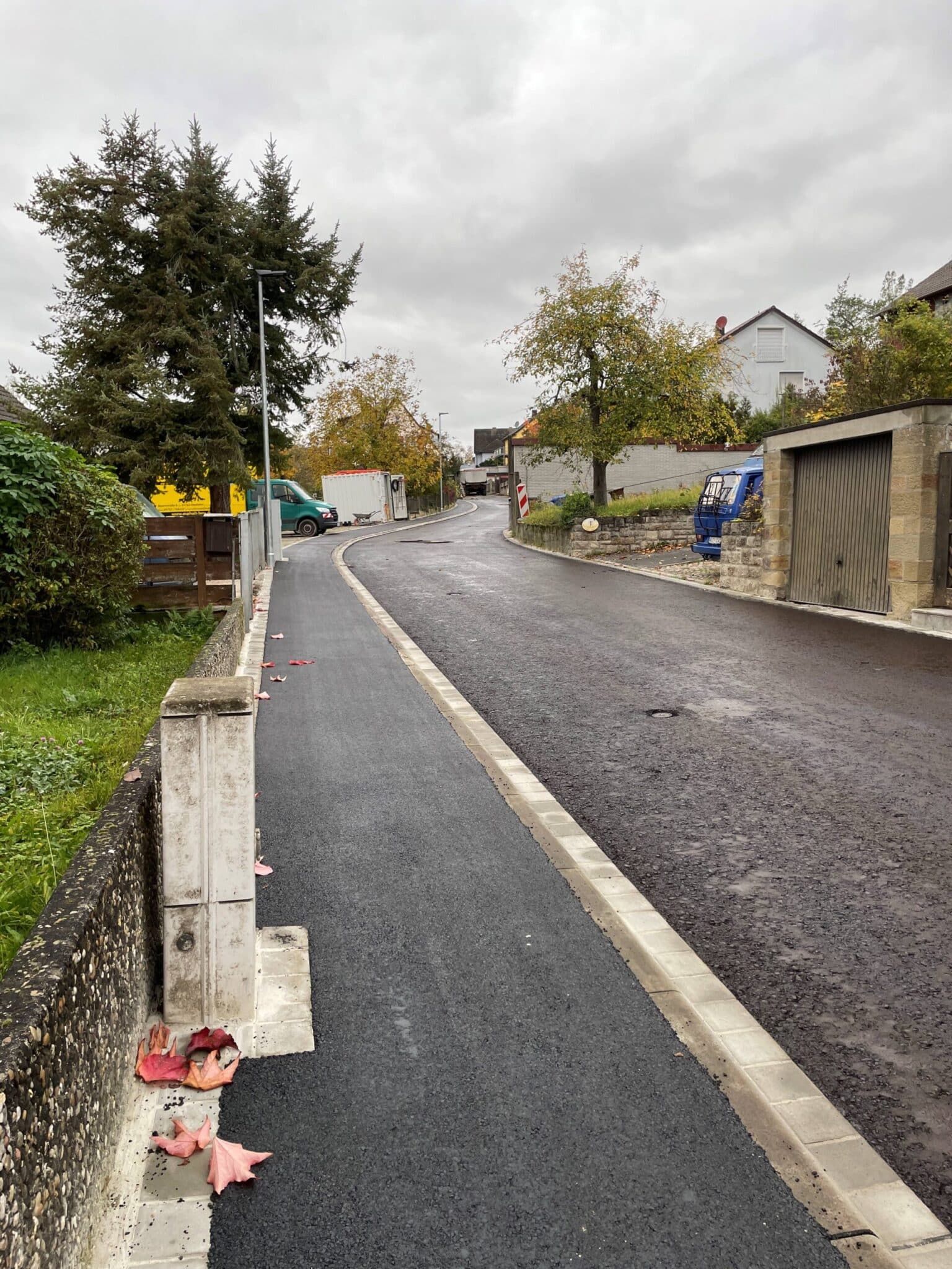Zwischenzeitlich wurde im Bauabschnitt 2 der Gehweg fertiggestellt und in der Straße die Asphalttragschicht eingebaut.