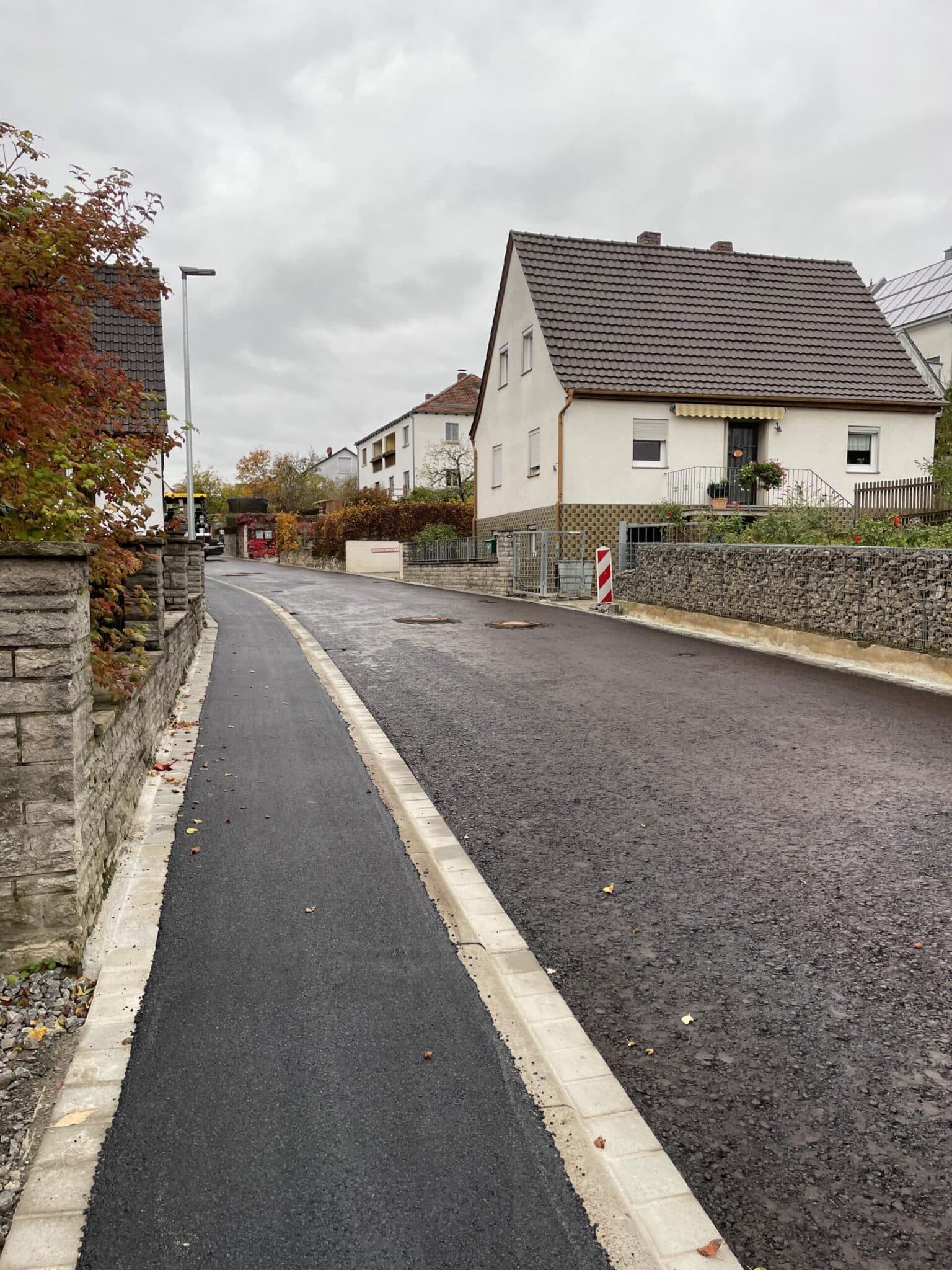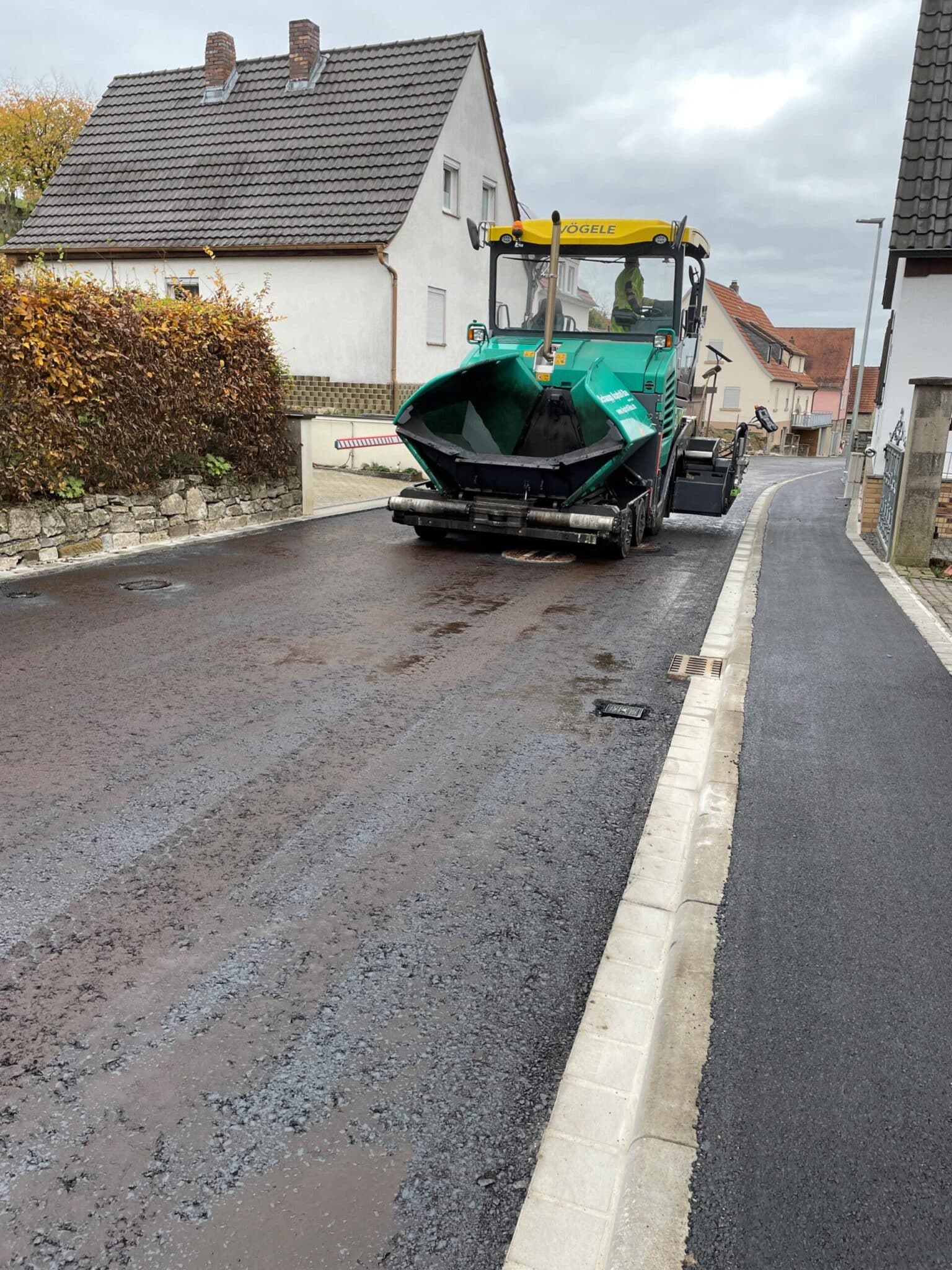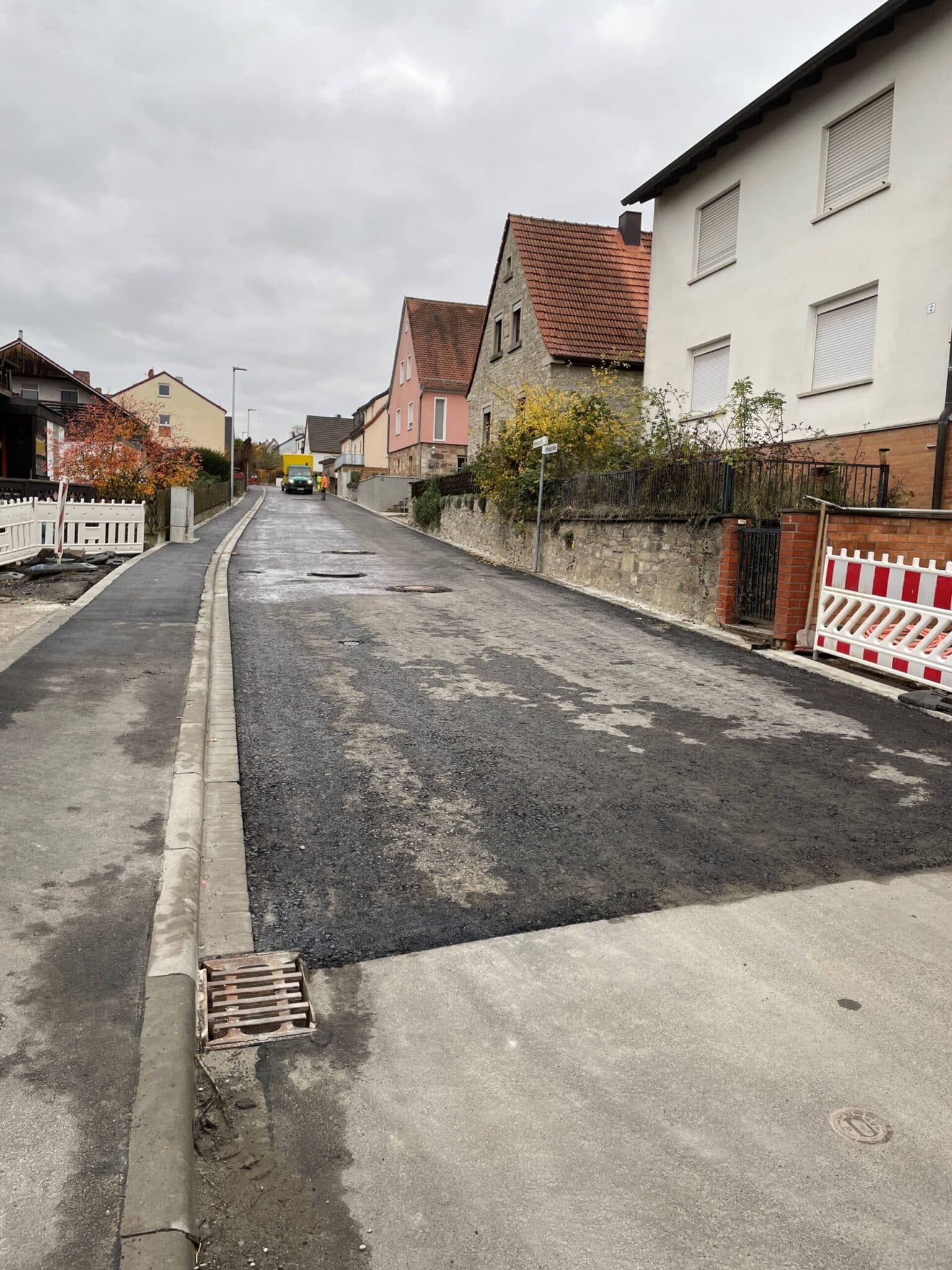 Zwischenzeitlich wurde im Bauabschnitt 2 der Gehweg fertiggestellt und in der Straße die Asphalttragschicht eingebaut.
