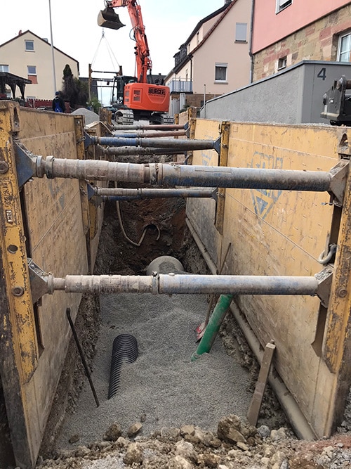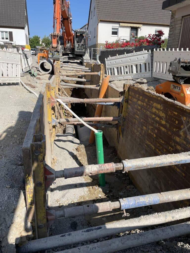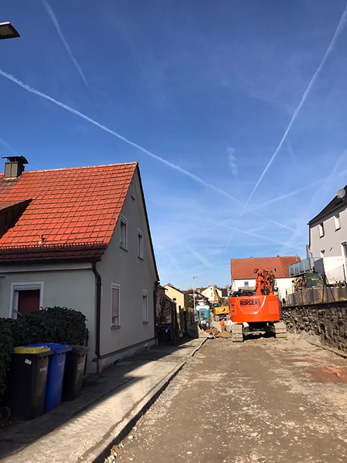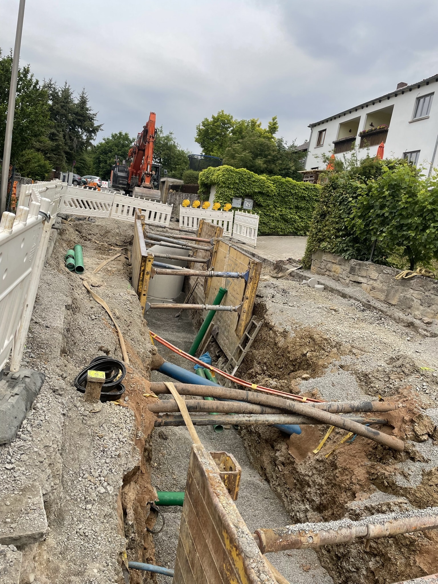 – aktuell laufen die Kanalarbeiten parallel vor den Anwesen Frühlingstraße 10/12 sowie Frühlingstraße 4.